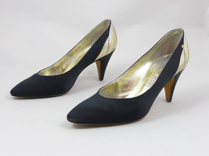 PAIO DI DÉCOLLETÉ - PAIR OF COURT SHOES Gucci in raso neroe inserti di pelle dorata, lievi difetti, tg 37