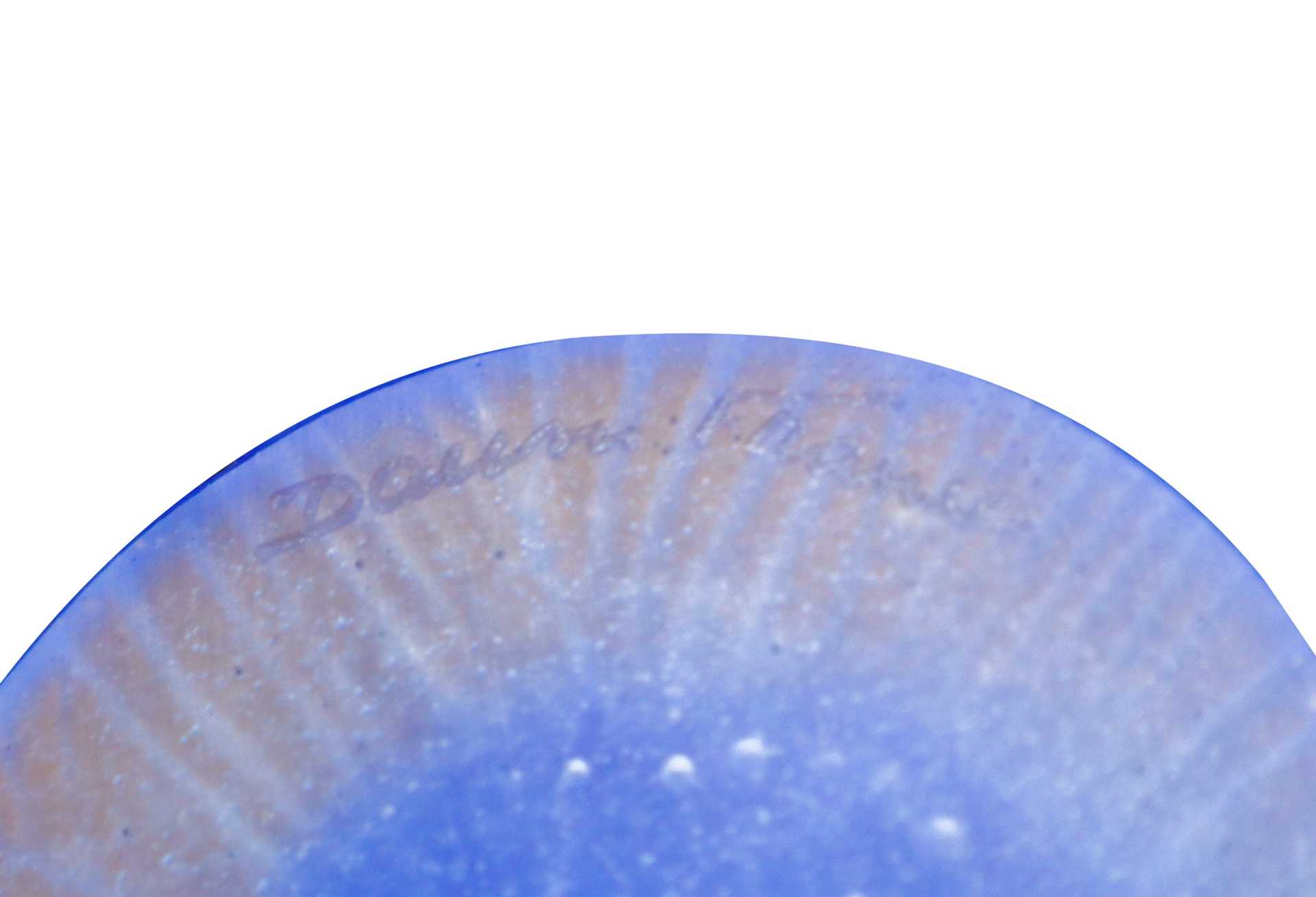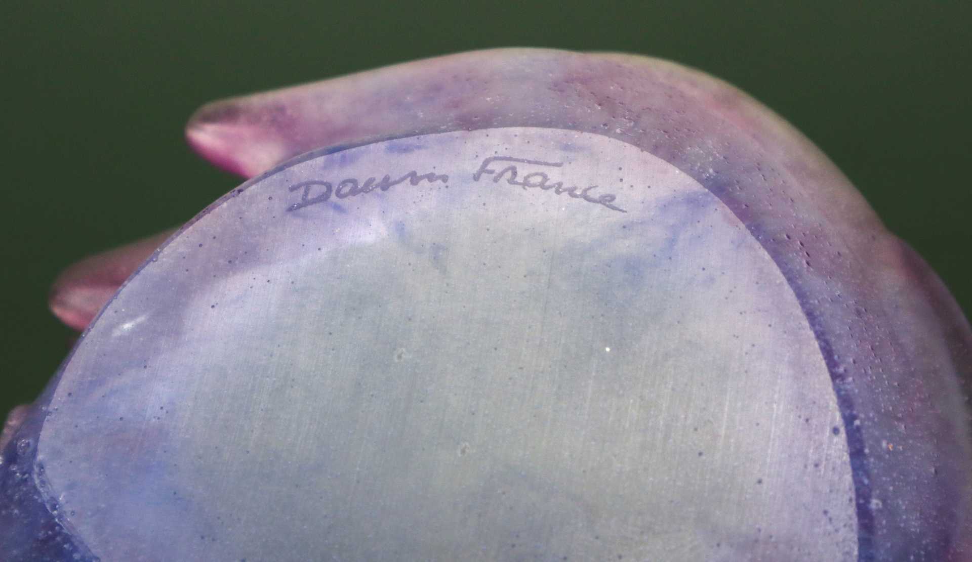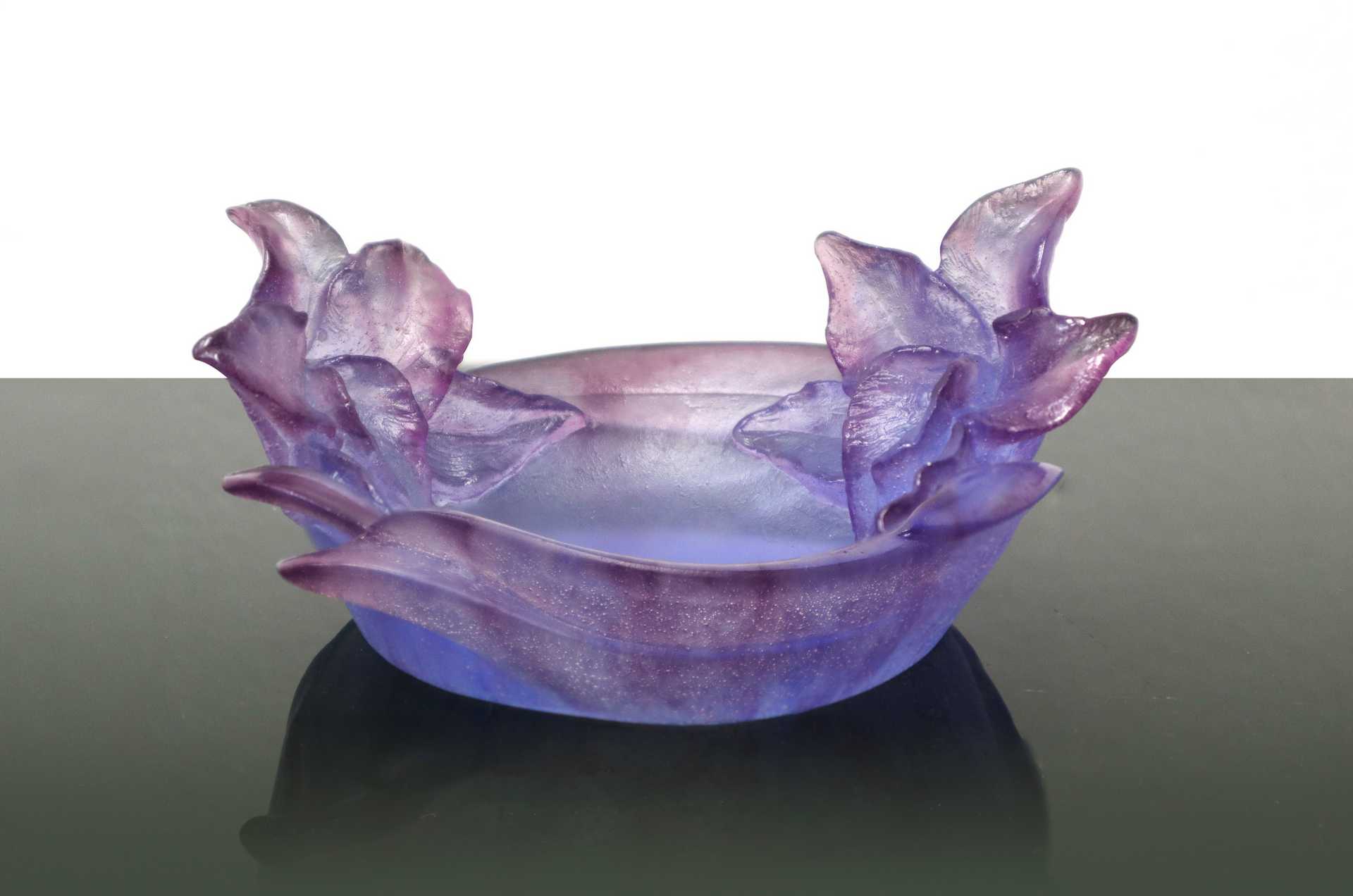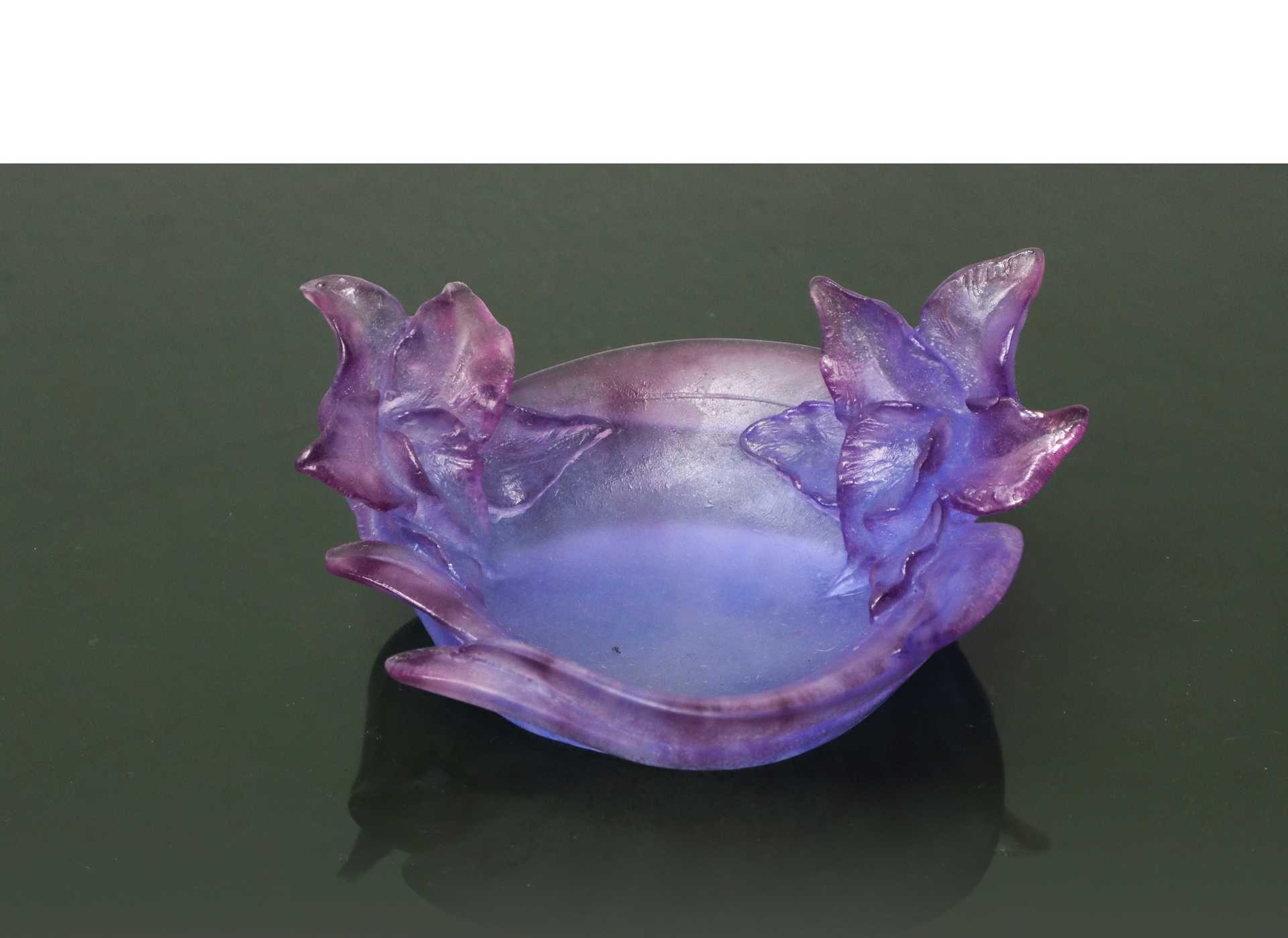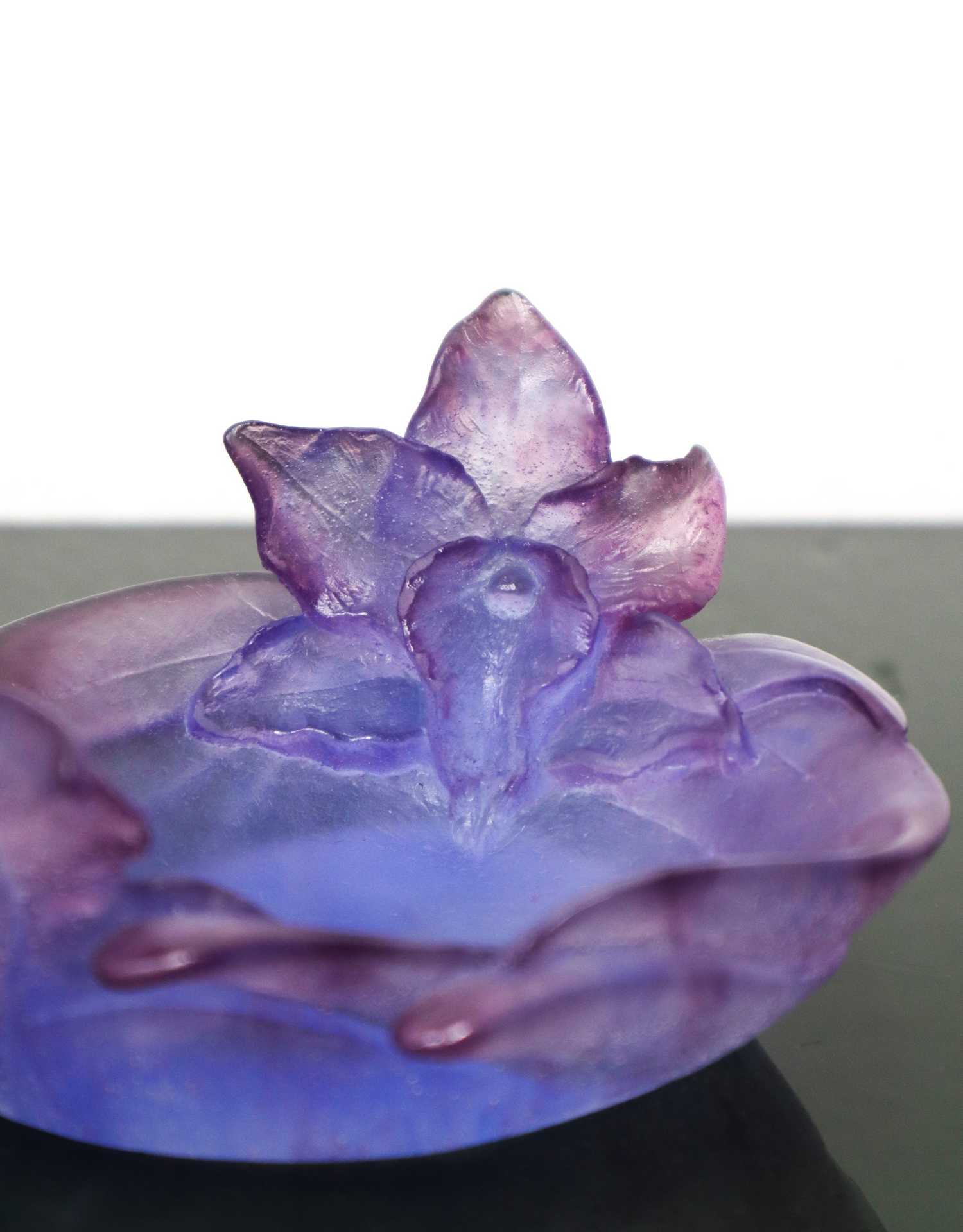 Daum France - Vaso e piccolo piatto in cristallo Daum mod. Orchidea, 20th secolo vaso H cm21x12; posacenere diametro cm 10,4 pasta di vetro ad fusione a cera persa Nei toni dell'ametista e del blu, con applicazioni fitomorfe al vaso e applicazioni di volatili al posacenere. Firmato alla base con scatola originale, condizioni perfette. Presente certificazione. Marchio Daum France sul fondo