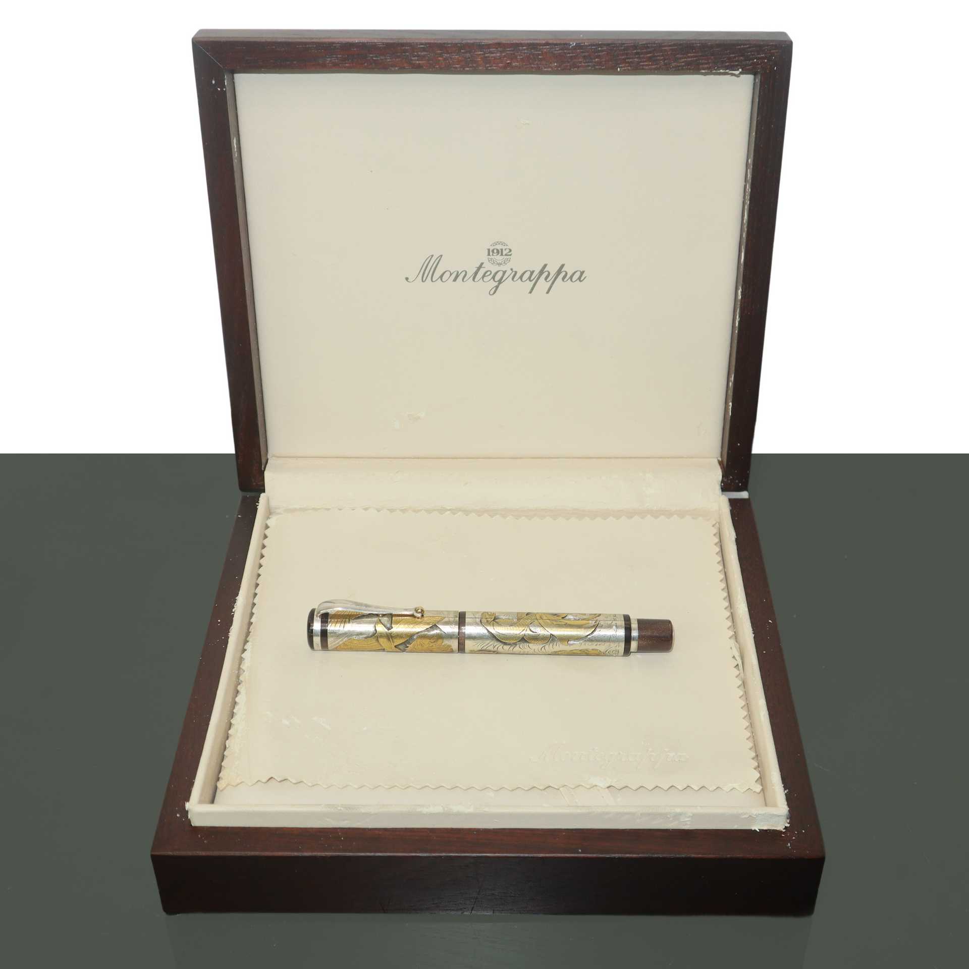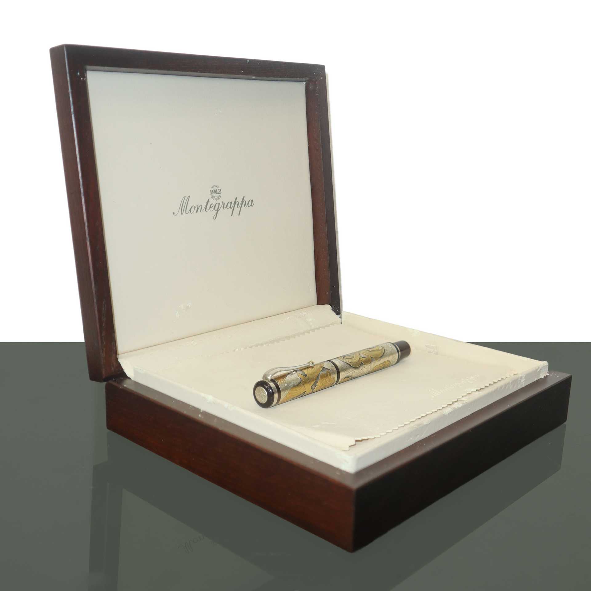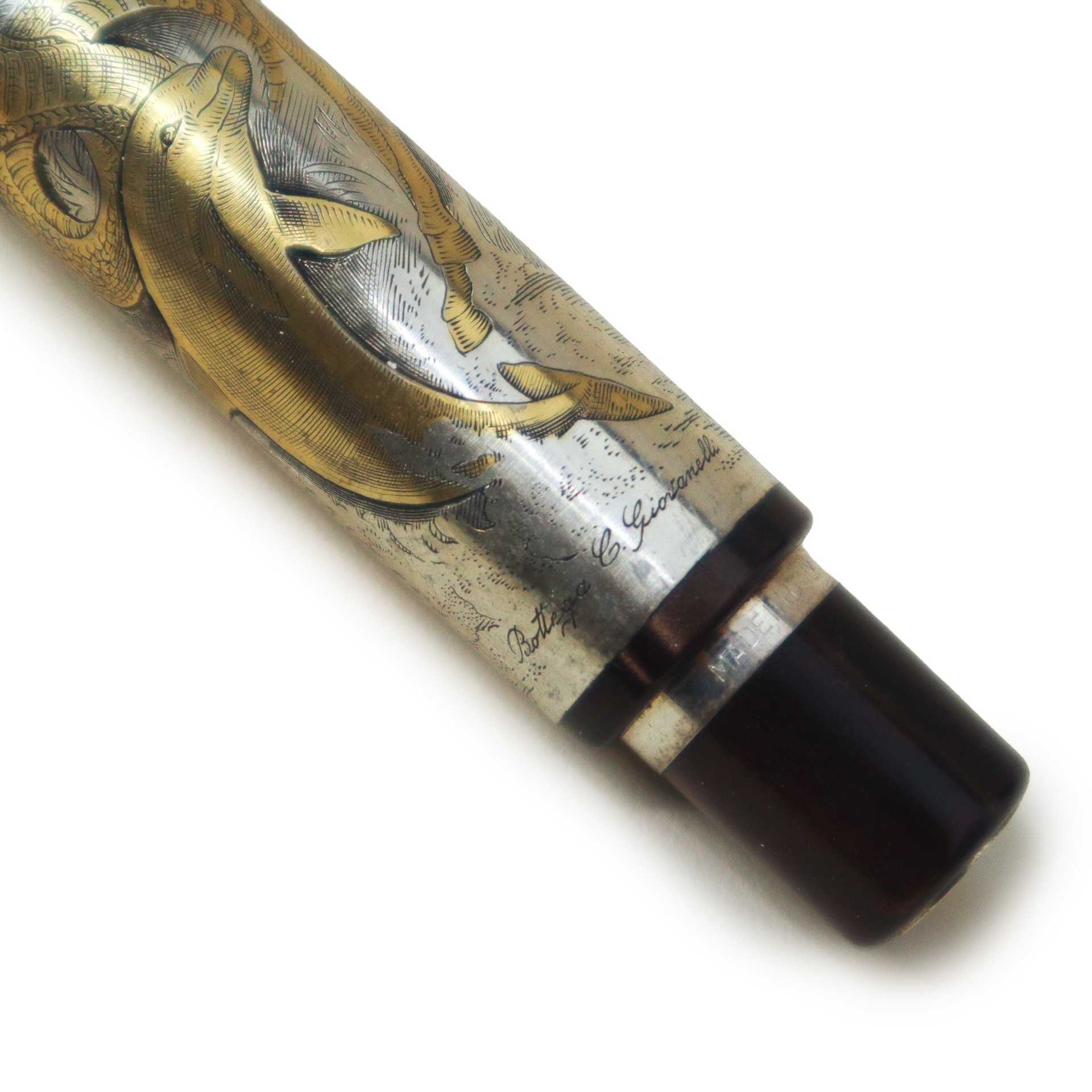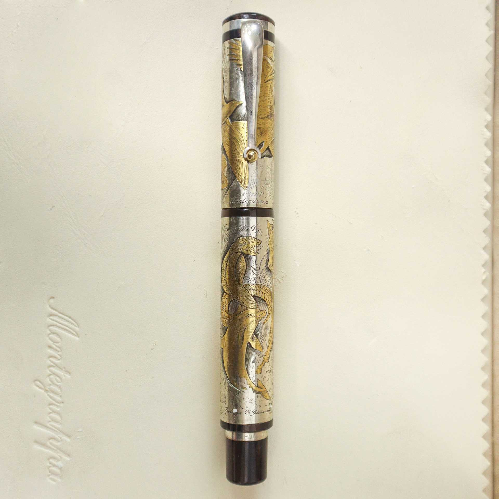 Penna stilografica "Animalia Limited Edition" in argento 925 Con scatola in legno originale. Con inserti dorati disegnati dalla bottega G. Giovannelli raffiguranti animali. Esemplare 365 di 1100. Punta in oro 750 Con scatola in legno originale. Con inserti dorati disegnati dalla bottega G. Giovannelli raffiguranti animali. Esemplare 365 di 1100. Punta in oro 750