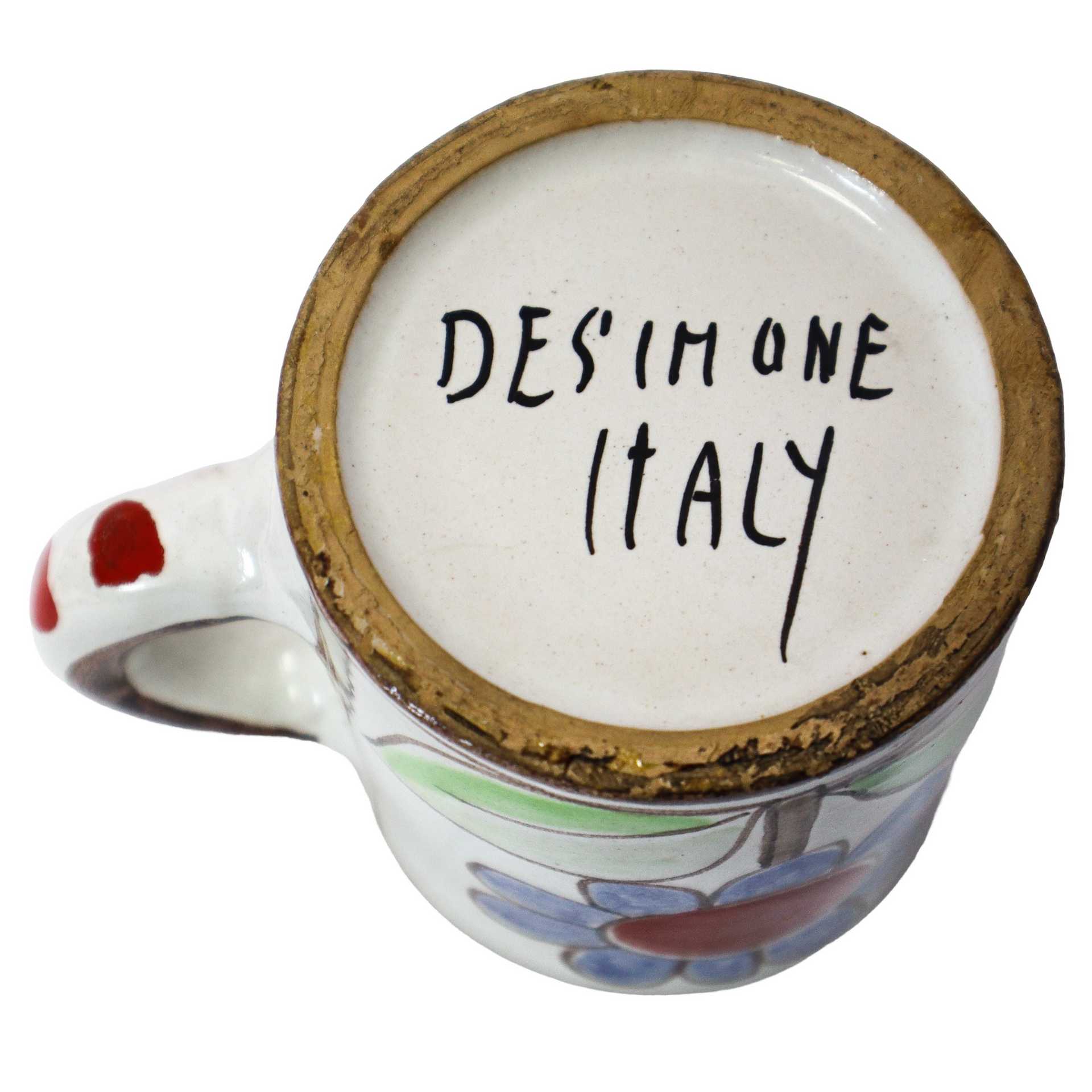 De Simone - Boccale e bicchiere in ceramica dipinta a mano con pesce e pianta rossa, 1960/1970 H cm 15,5x18,5 Firmato alla base De Simone Italy 64/13. Leggermente sbeccata al bordo. Firmato alla base De Simone Italy 64/13. Leggermente sbeccata al bordo.