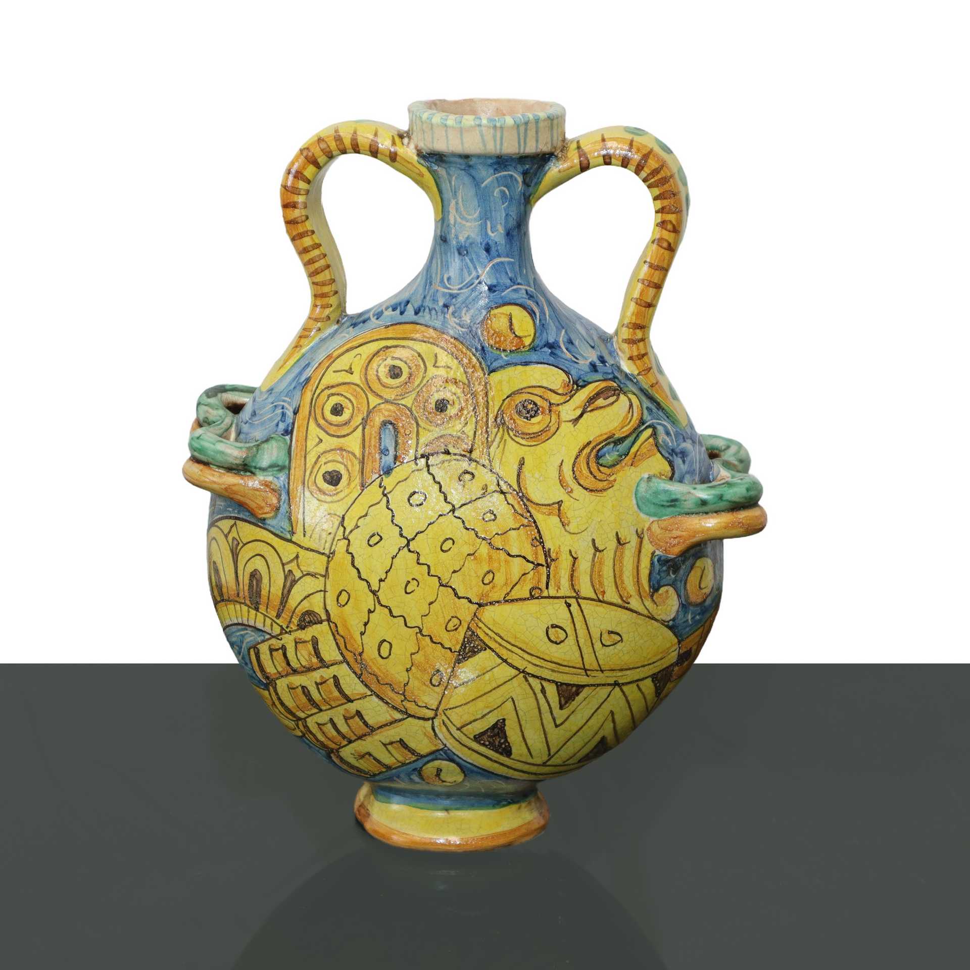 Fiasca con manici in maiolica di Caltagirone, sul fronte ritratto di donna entro riserve H cm 25 x 21