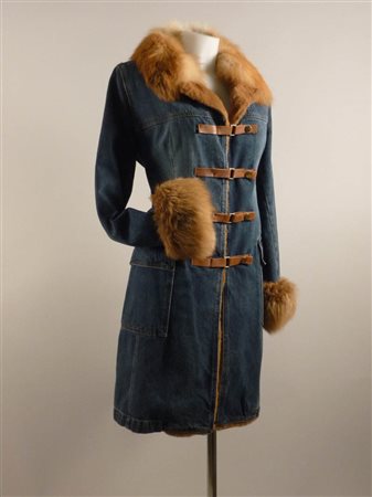 GIACCONE IN JEANS E PELLICCIA - FUR AND JEANS COAT allacciatura con chiusure a nastri in pelle, maniche, collo e interno bordati di pelliccia tg L circa