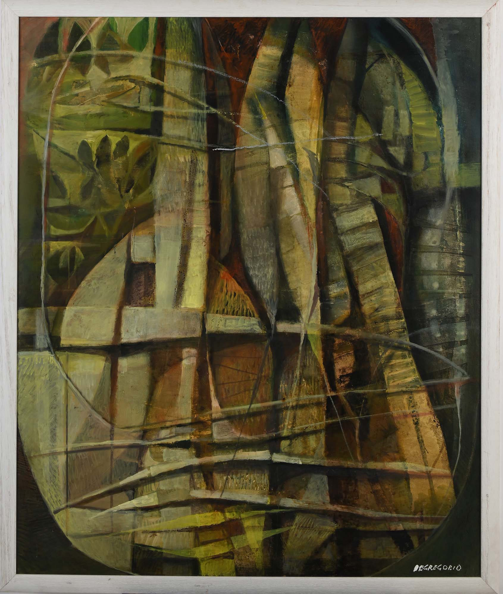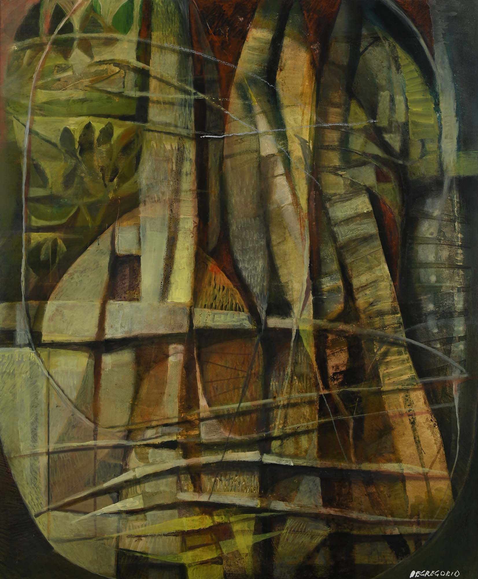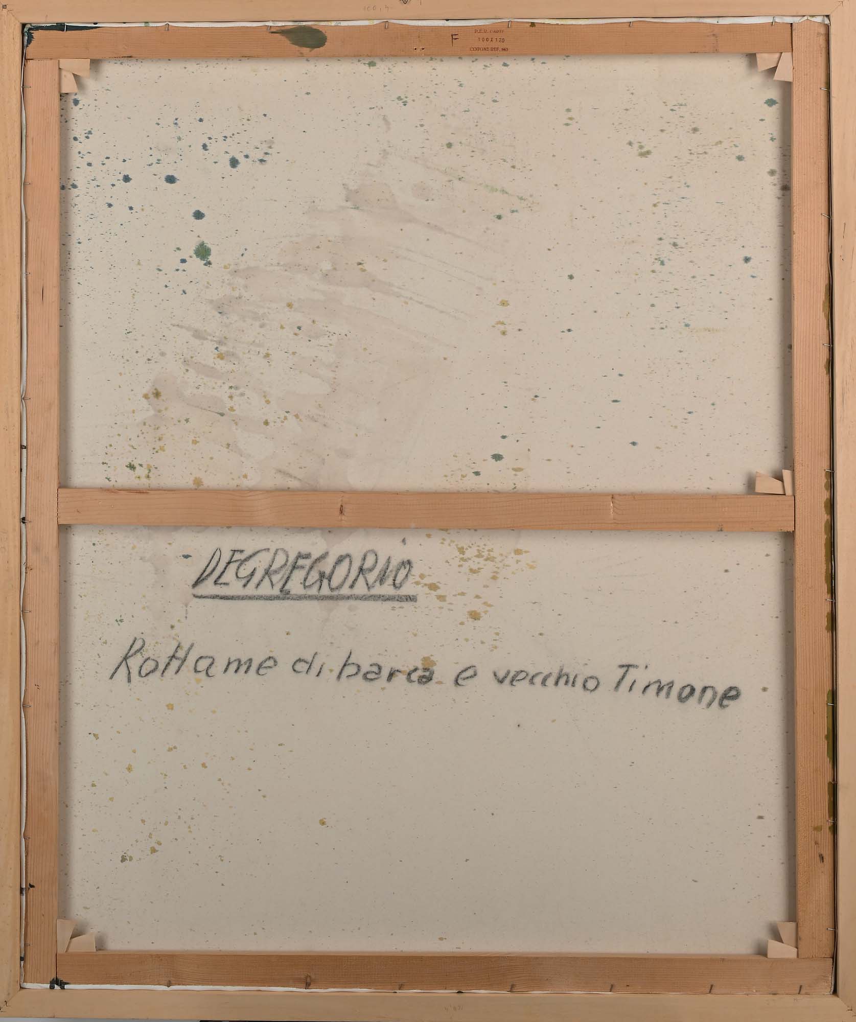 Giuseppe De Gregorio Rottame di barca e vecchio timone Primi anni '80 Olio su tela cm 120x100 - in cornice cm 127x107 Firma in basso a destra "De Gregorio". Al verso reca titolo e firma Certificato di autenticità rilasciato dall'Archivio Opere Giuseppe De Gregorio, Nonantola (MO)