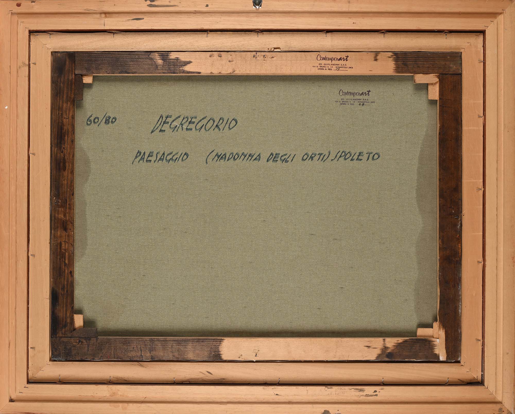 Giuseppe De Gregorio Paesaggio (Madonna degli orti) Spoleto Primi anni '80 Olio su tela cm 60x80 - in cornice cm 82x102 Firma in basso a destra "De Gregorio". Al verso reca firma, titolo e timbro ContemporArt Ghirlandina Modena Certificato di autenticità rilasciato dall'Archivio Opere Giuseppe De Gregorio, Nonantola (MO)