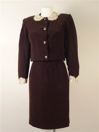 COMPOSÈ IN VELLUTINO MARRONE - BROWN VELVET COMPOSÈ giacchina corta con tre bottoni, colletto e polsini bordati in pizzo, gonna a linea dritta tg M circa