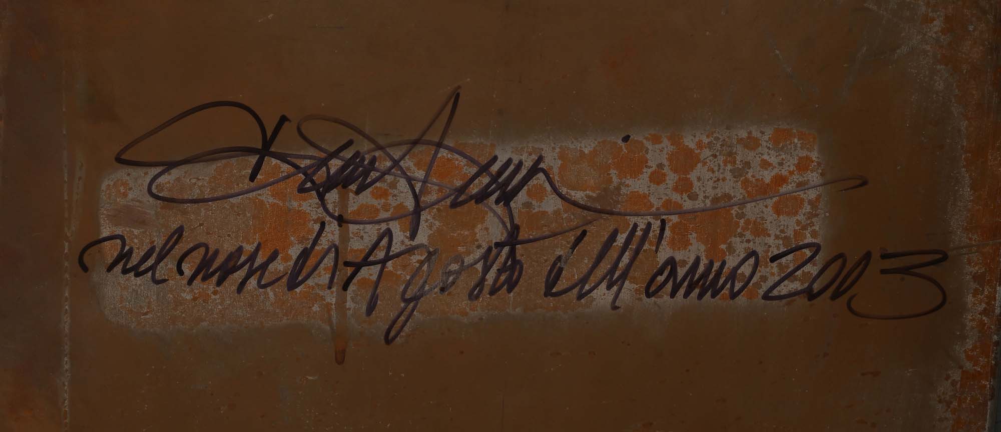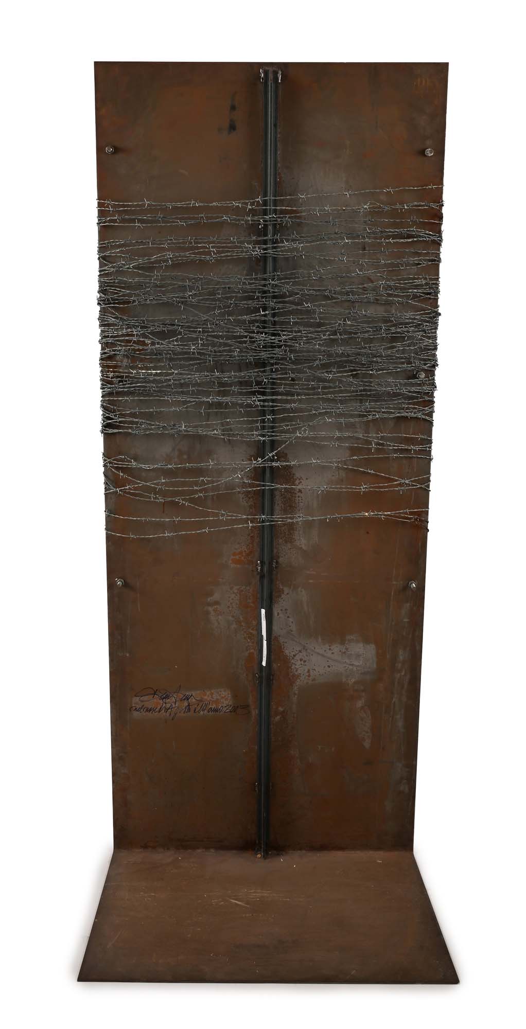 Davide Dormino Senza titolo 2003 Scultura in ferro, filo spinato e plexiglass cm 200x80x10,5 Al verso reca firma e data "Davide Dormino nel mese di Agosto 2003"