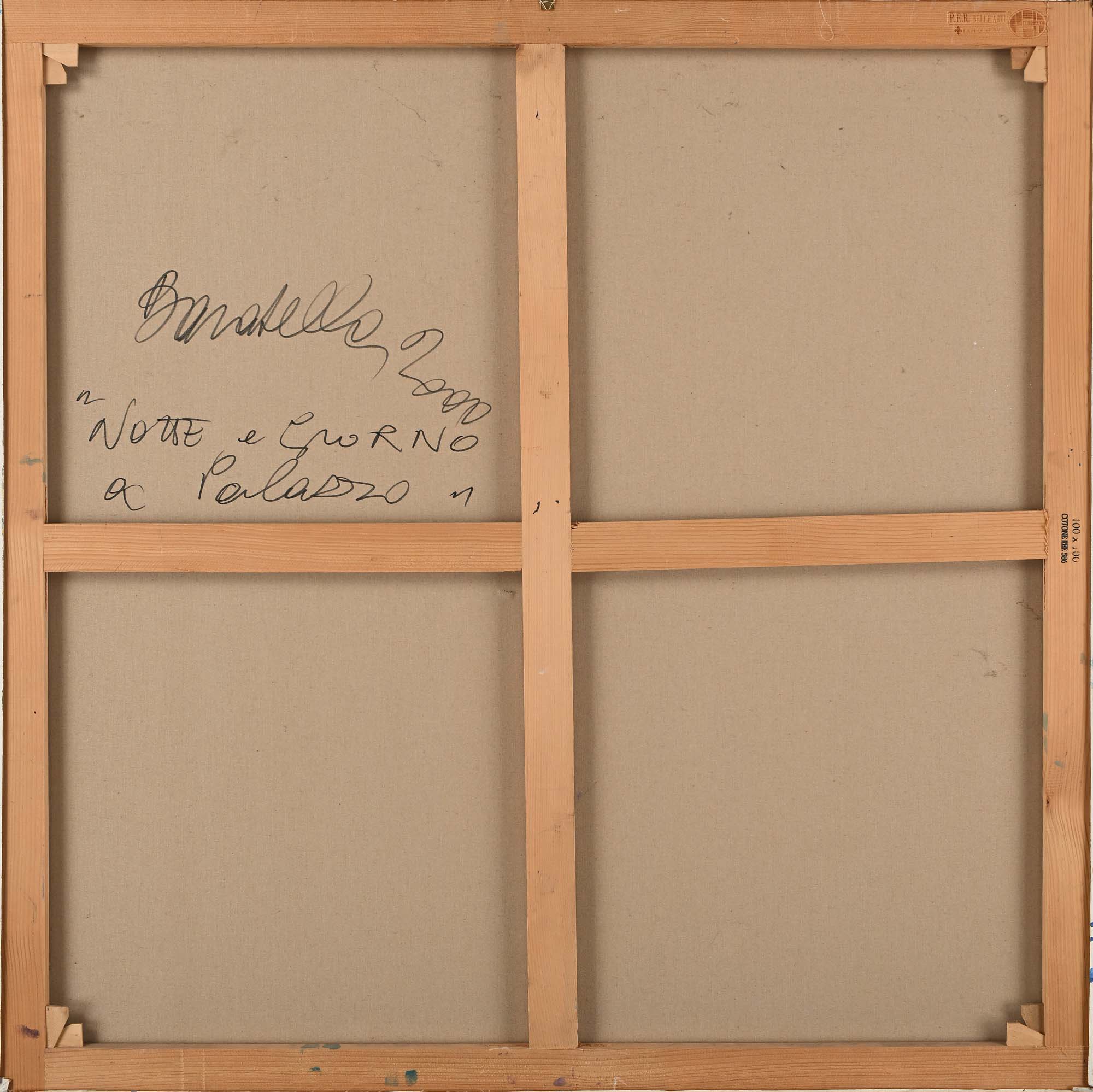 Paolo Baratella Notte e giorno a palazzo 2000 Olio su tela cm 100x100 Firma, titolo e data al verso "Paolo Baratella 2000" Certificato di autenticità su fotografia firmato di pugno dall'artista
