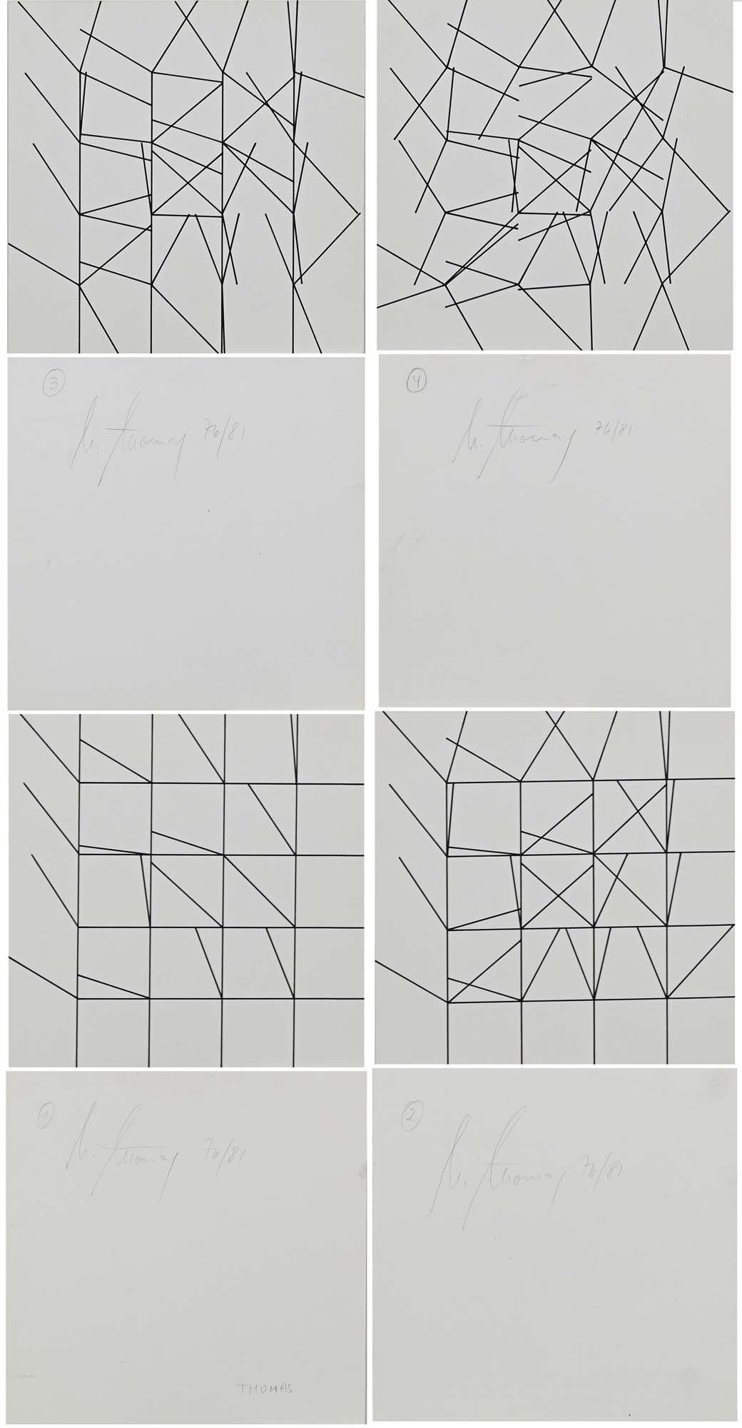 Norbert Thomas Senza titolo 1976-1981 pennarello su cartoncino 4 elementi di cm 15x15 l'uno Ogni elemento è firmato e datato al retro "N.Thomas 76/81".