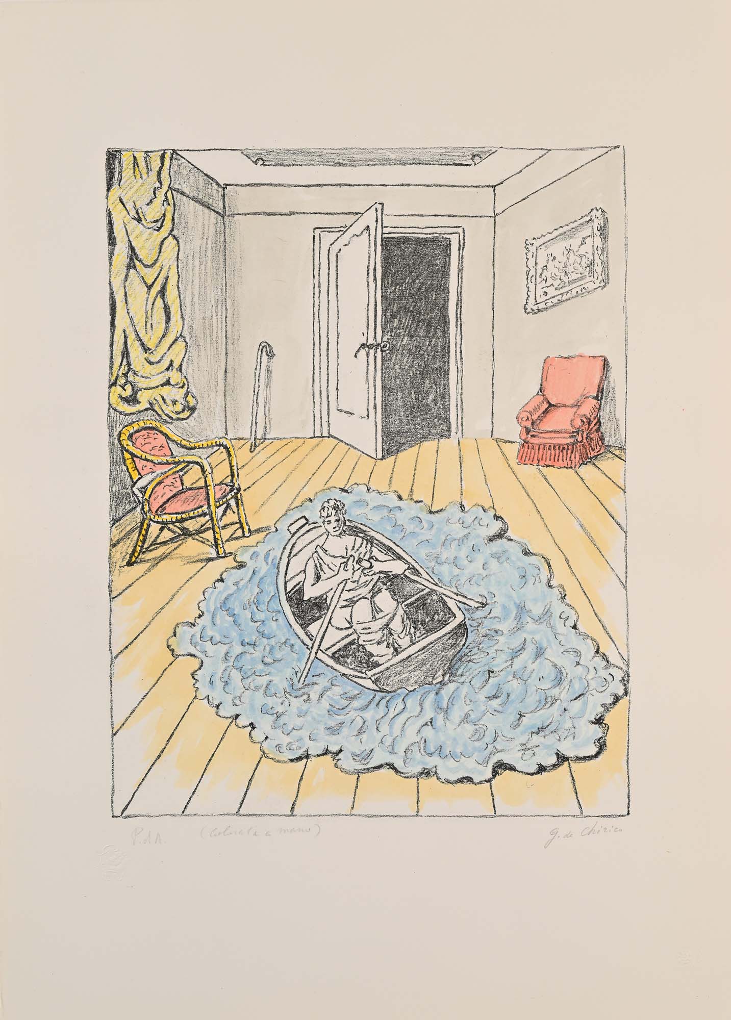 Giorgio De Chirico Il ritorno di Ulisse 1973 Litografia e acquarello su carta cm 70x50 Firma e numerazione "G. De Chirico p.d.a. colorata a mano".Timbro a secco "Giorgio De Chirico" e "Alberto Caprini stampatore in Roma".