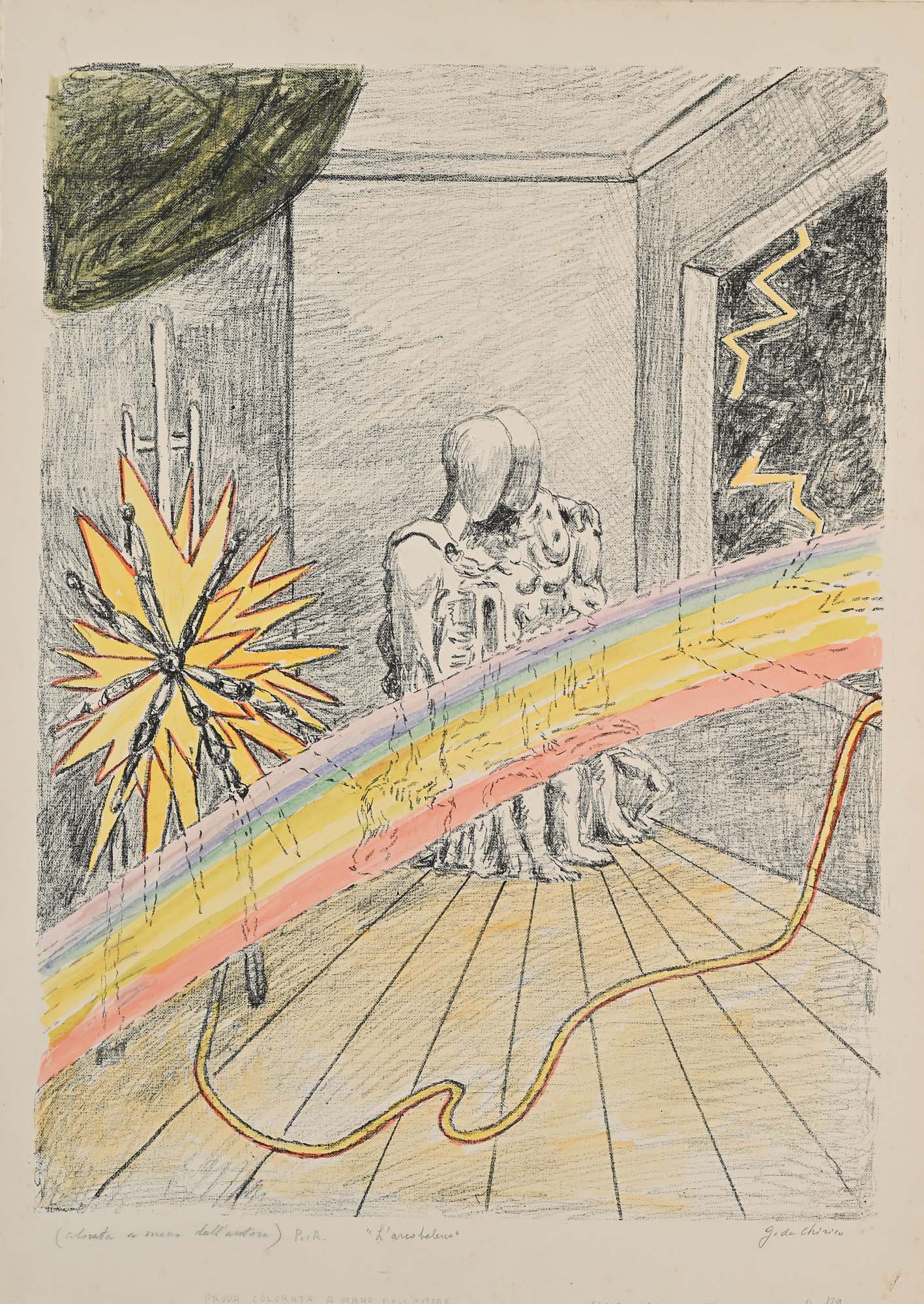 Giorgio De Chirico L'arcobaleno 1969 Litografia e acquarello su carta cm 70x50,5 Firma, titolo e numerazione "G. De Chirico l'Arcobaleno Colorata a mano dall'autore p.a."