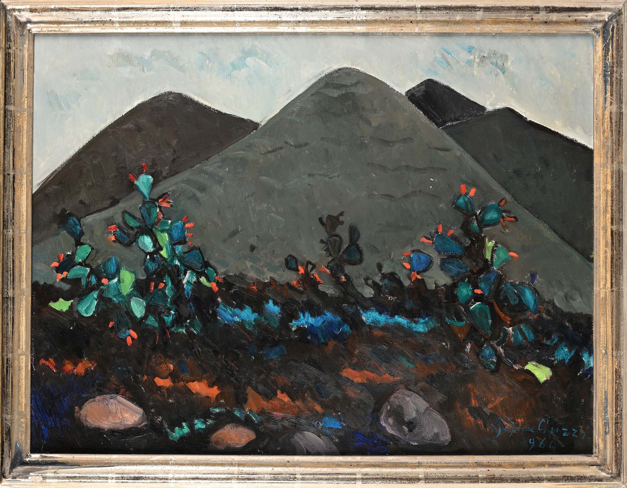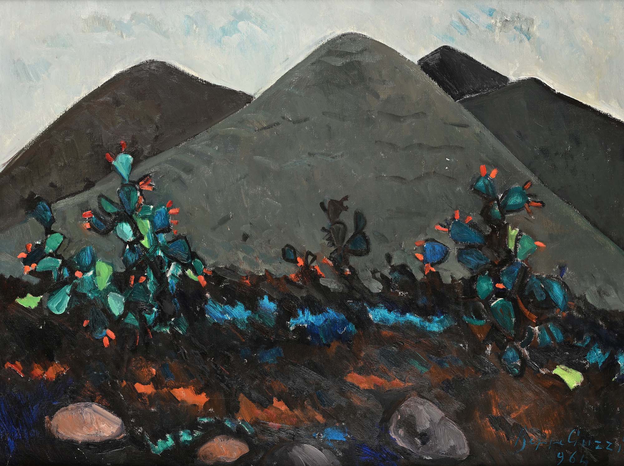Beppe Guzzi Paesaggio di montagna con cactus in fiore 1964 Olio su tela cm...