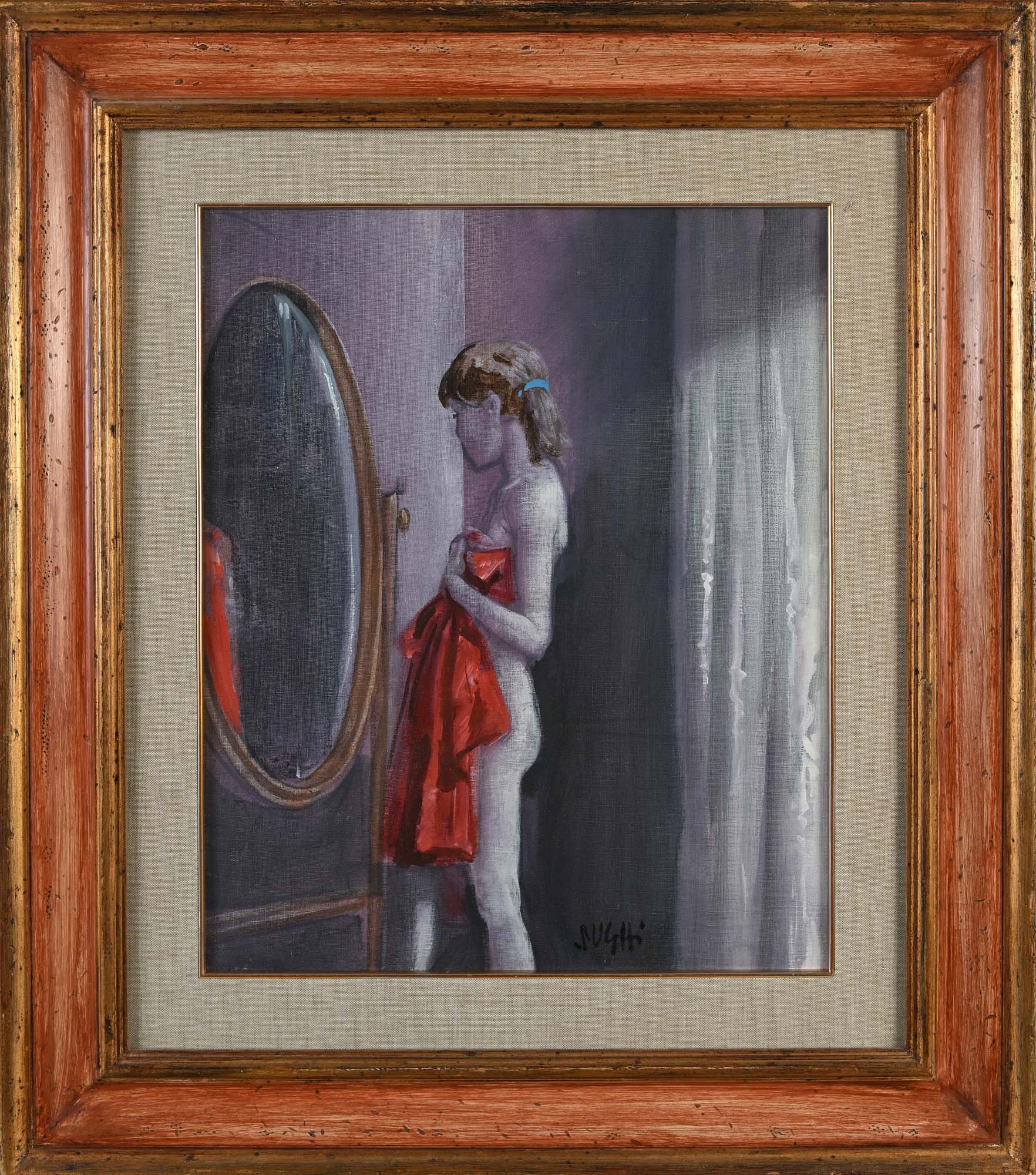 Alberto Sughi Ragazza allo specchio Olio su tela cm 46x38 - in cornice cm 70x62 Firma in basso al centro "Sughi". Al verso reca etichetta "Nuovo Aminta"