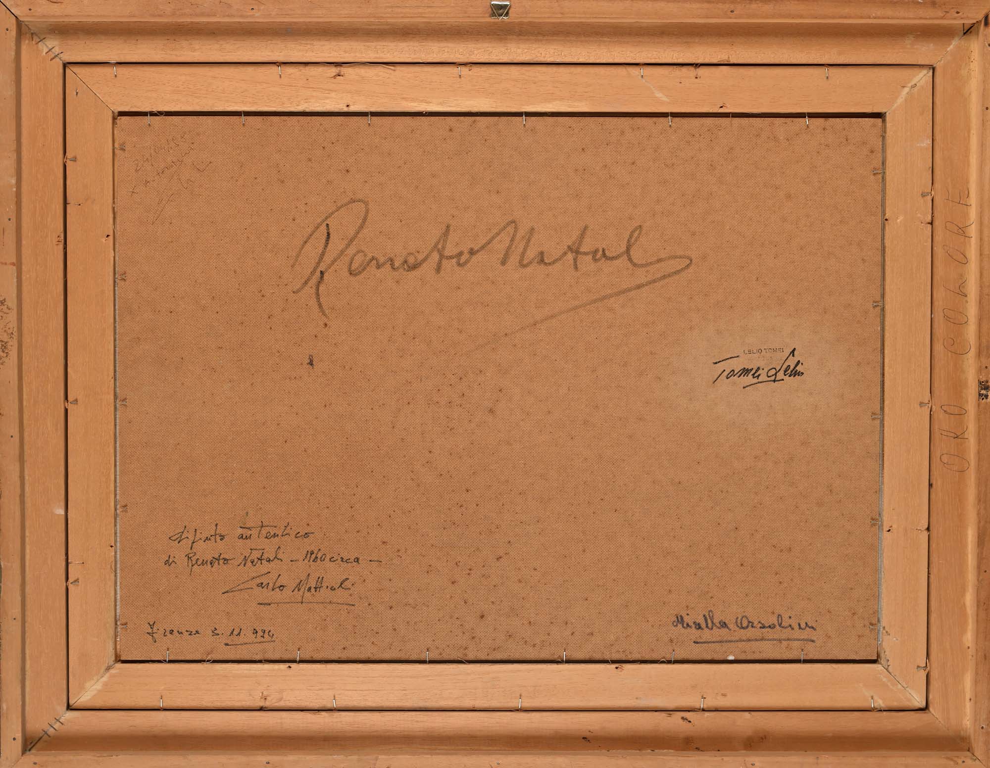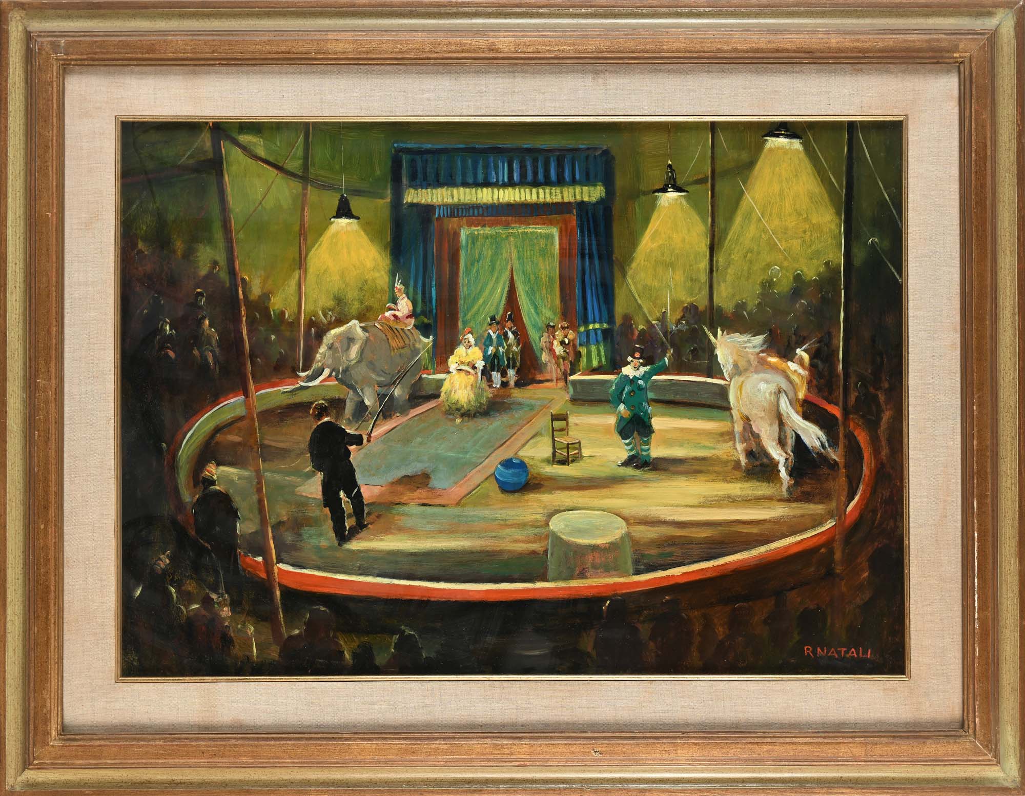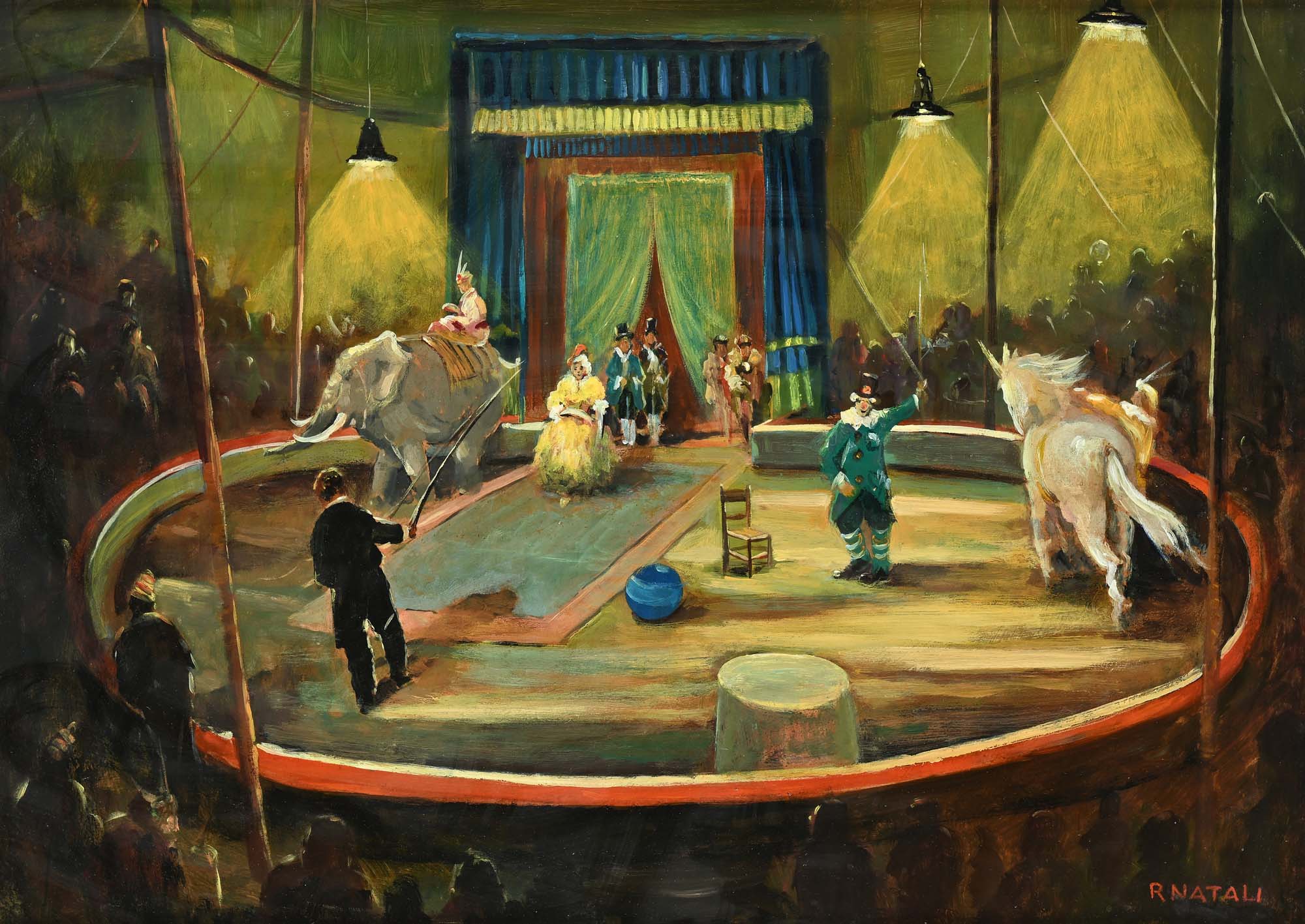 Renato Natali Il Circo Anni '60 circa Olio su faesite cm 50x70 - in cornice cm Firma in basso a destra "R. Natali". Al verso reca firma "Renato Natali", autentica firmata "Carlo Mattioli"
