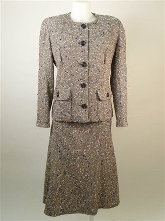 TAILLEUR IN LANA BOUCLE - BUCLE WOOL TAILLEUR nei toni del grigio tasche con pattina e gonna a linea dritta tg M circa