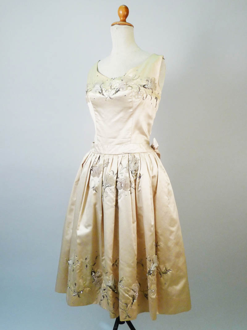 ABITO IN CREPE GRIGIA E PERLINE - GRAY CREPE DRESS maniche lunghe (scucite) linea dritta interamente lavorato in strass a righe verticali, difetti e scuciture tg M circa