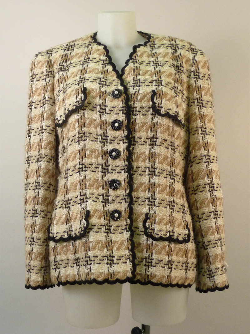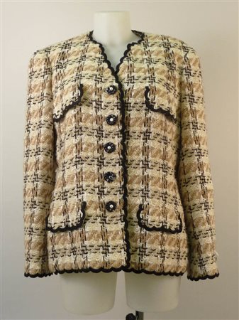 GIACCHINA IN LANA NEI TONI DEL MARRONE E DEL PANNA - CREAM WOOL JACKET bordura con passamaneria nera stondata, bottoni a forma di fiore impreziositi da perle bianche, taschine con pattina tg M circa