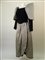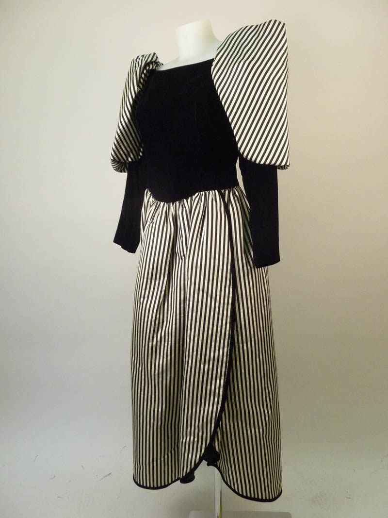 LUNGO ABITO A RIGHE - STRAIGHT LINE DRESS nei toni del nero e del bianco, a linee verticali, spalle a sbuffo in tessuto e corpino e maniche in velluto nero rifinito con passamaneria in vellutino nero e gonna ampia tg M circa