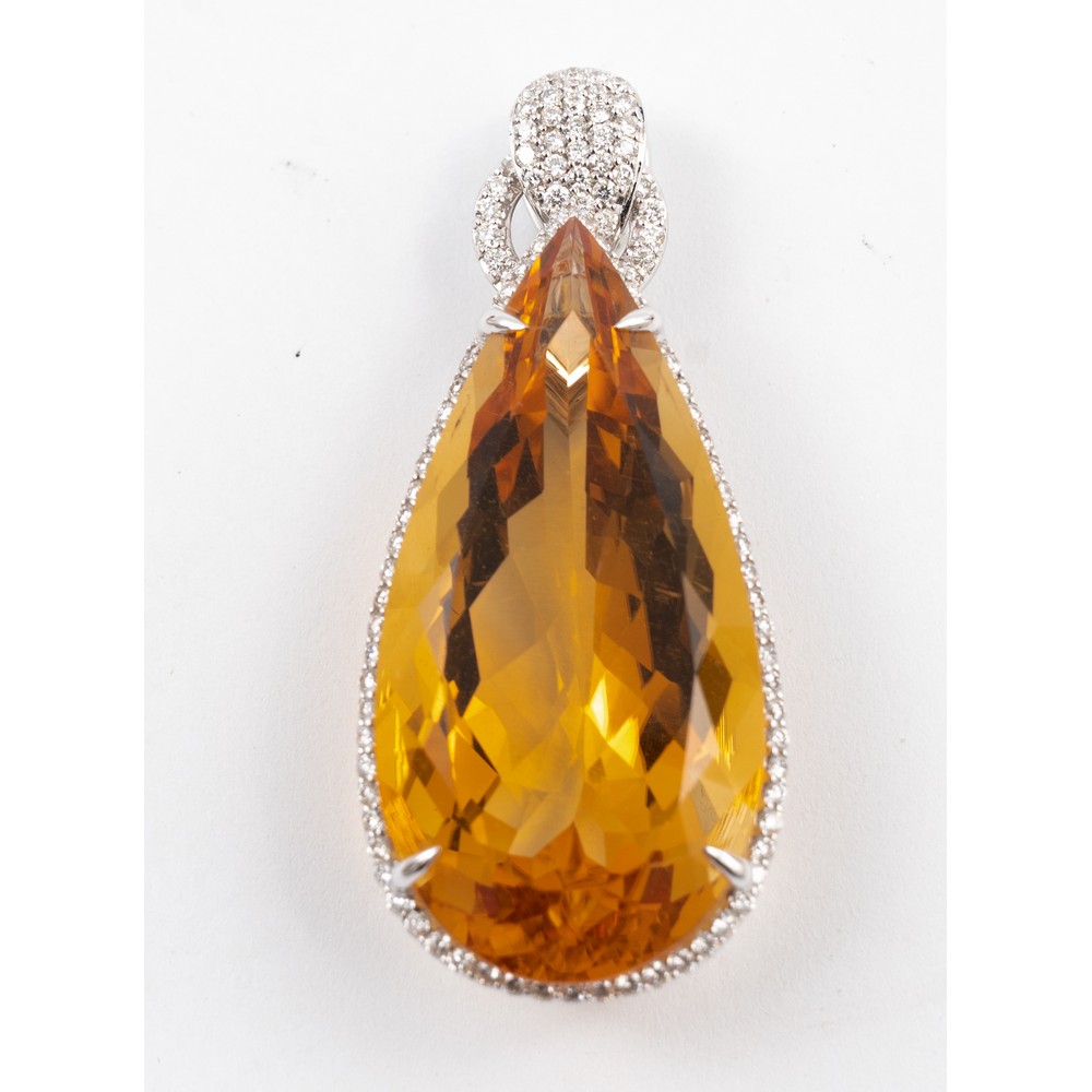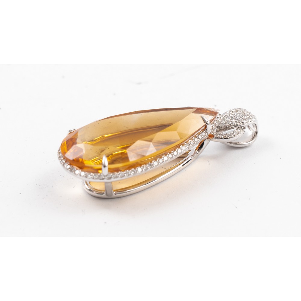 PENDENTE in oro bianco 18 KT con diamanti taglio brillante ct. 0,73 e quarzo citrino (g. 12,90).