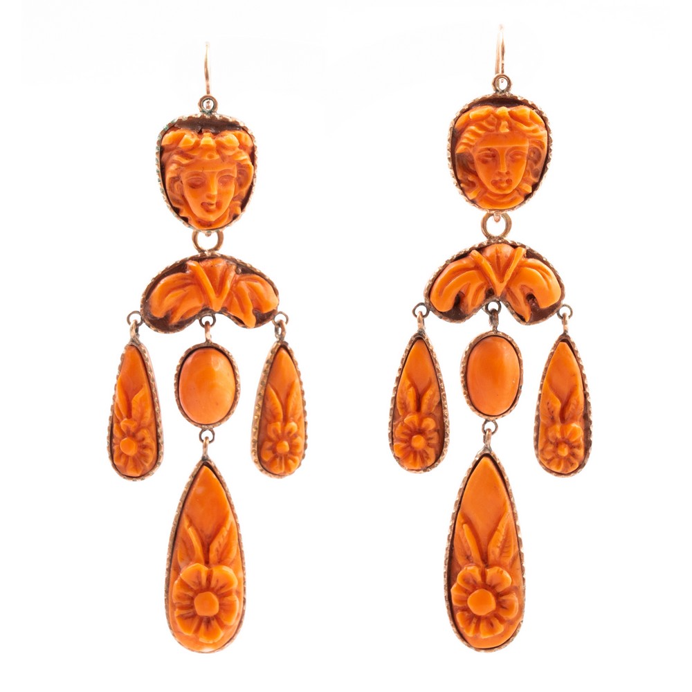 ORECCHINI in oro giallo 9 KT e corallo scolpito (g. 29,77).