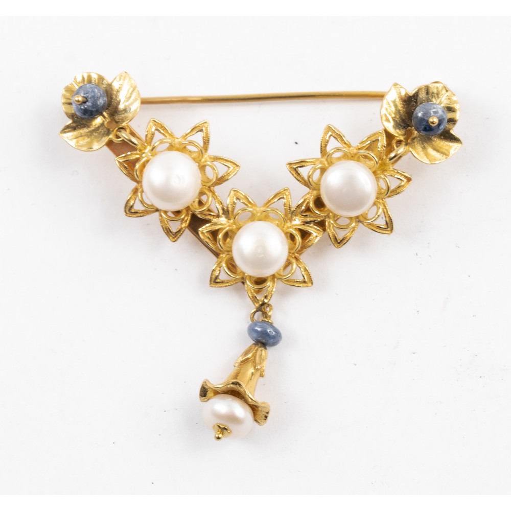 SPILLA in oro giallo 18 KT con perle di fiume e zaffiri (g. 11,80).