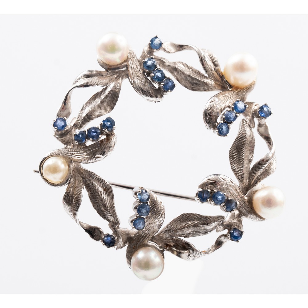 Lotto 88 | SPILLA in oro bianco 18 KT con zaffiri e perle