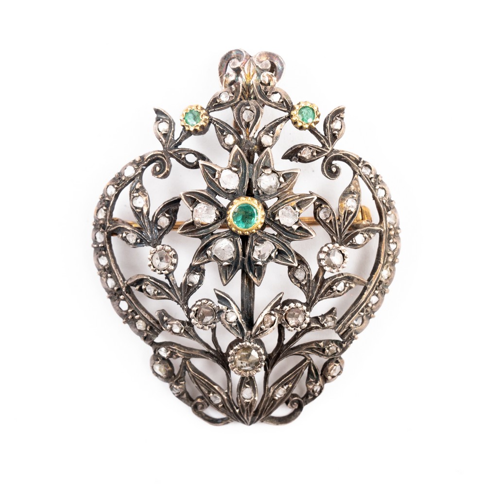 SPILLA in oro 9 KT e argento con diamanti vecchio taglio ct. 0,50 peso di stima e smeraldi ct. 0,05 peso di stima (g. 12,90) (mancanze).