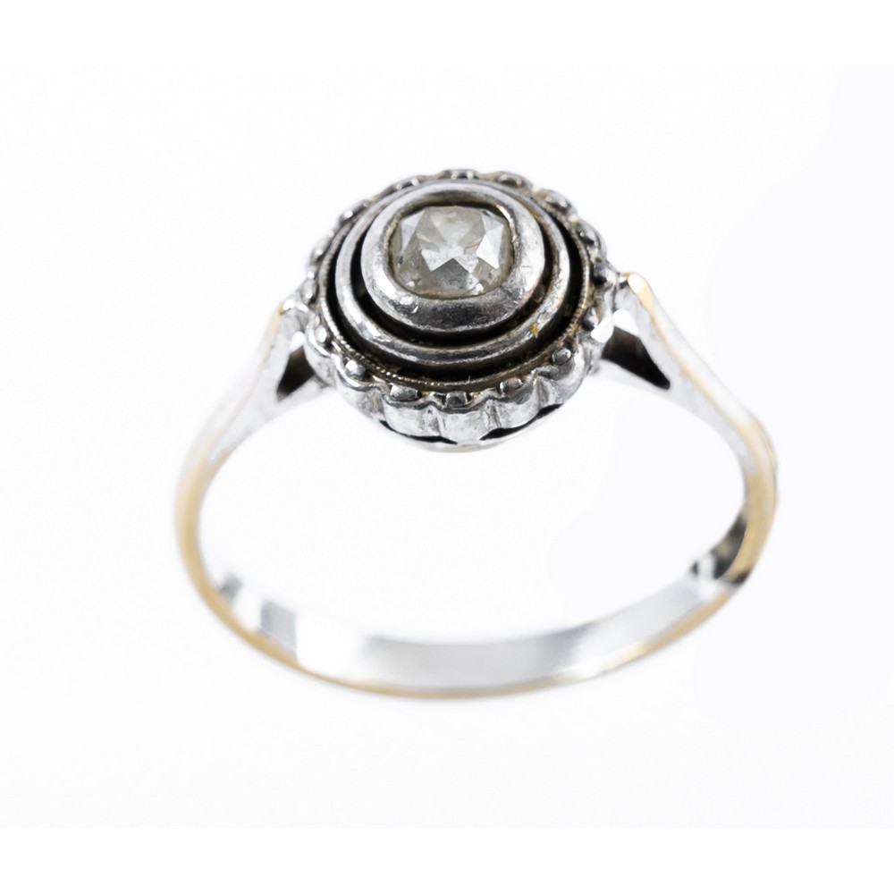ANELLO in oro giallo e bianco 18 KT ed argento con diamante vecchio taglio ct. 0,25 (g. 3,85).