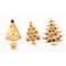 Tre spille albero di Natale: L.J.M spilla in metallo dorato con piccoli strass colorati di taglio differente, pietra sul vaso mancante; Produzione Americana spilla in metallo dorato con piccoli strass colorati; BROOKS spilla in metallo dorato con strass di taglio differente e colorati. Marchi di produzione.