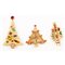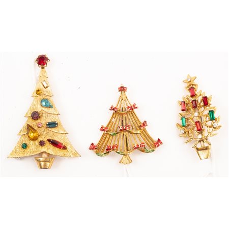 Tre spille albero di Natale: spilla in metallo dorato satinato con strass colorati di taglio differente; spilla in metallo dorato e smaltato, decorato al centro con fiocchetti Rossi; spilla in metallo dorato con strass colorati di taglio differente.