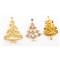 Tre spille albero di Natale: J.J. spilla in metallo dorato e satinato con piccoli strass bianchi, pietra mancante; Produzione Americana spilla in metallo dorato ed argentato con piccoli cabochon rossi ; Produzione Americana spilla in metallo dorato con strass di taglio differente e colorati. Marchio di produzione.