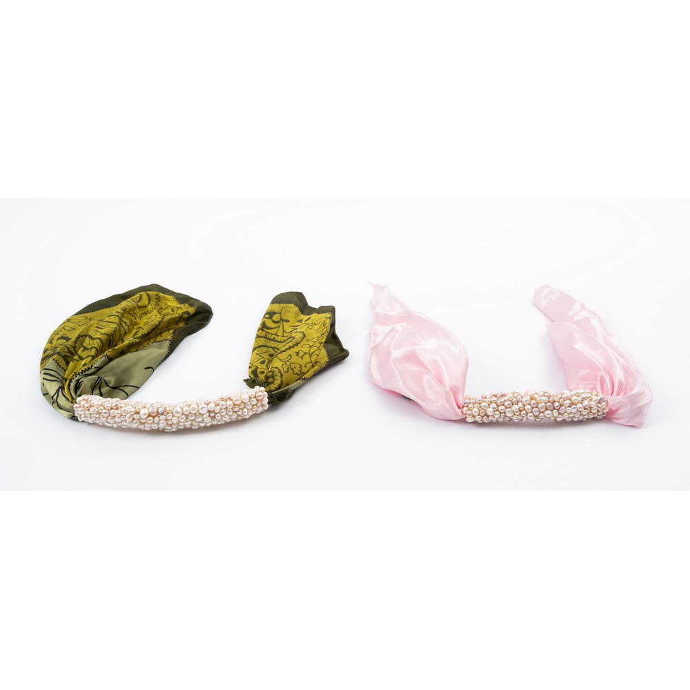 DUE FOULARD di cui uno nei toni del verde e uno del rosa con perle di fiume.