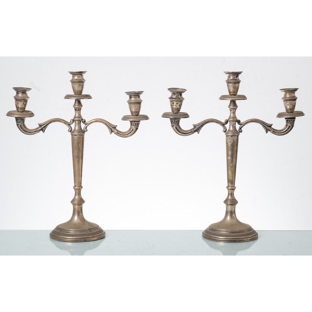 COPPIA DI CANDELABRI in argento sbalzato a tre fiamme. Argentiere Formusa Pietro Palermo (g. 616).