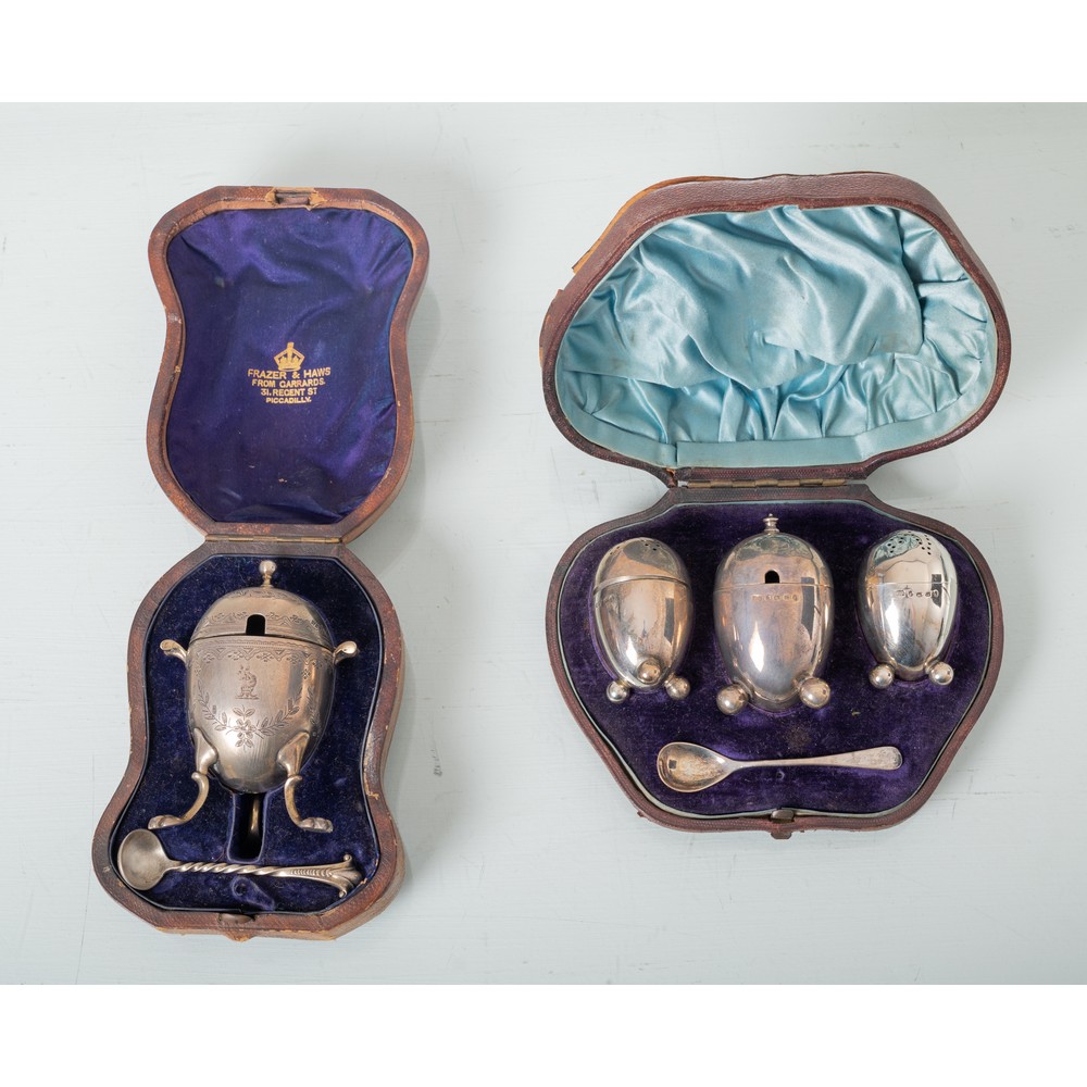 Set in argento 925 composto da sale e pepe, oviera con vaschetta in vetro blu con cucchiaino entro custodia. Argentiere Henry Hutton Bourne; oviera con cucchiaino in argento 925 cesellato con vaschetta in vetro trasparente entro custodia.