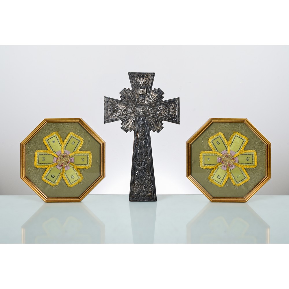Croce in argento cesellato e due elementi sacri in tessuto e filigrana.