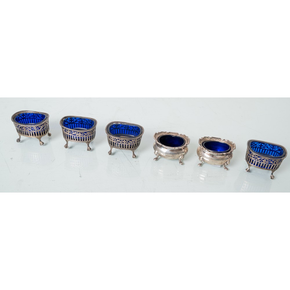 Quattro saliere in argento con piedi a zampa leonina e vaschette in vetro blu. Argentiere George Jackson & David Fullerton; coppia saliere in argento con vaschette in vetro blu (usure).