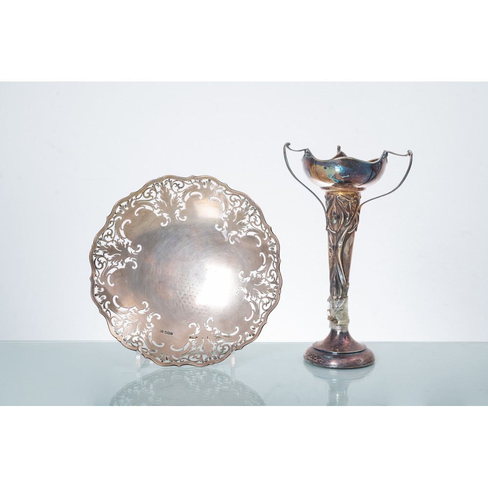 Vaso in argento sbalzato e centrotavola in argento 925 traforato (difetti e rottura) (g. 725 peso lordo).