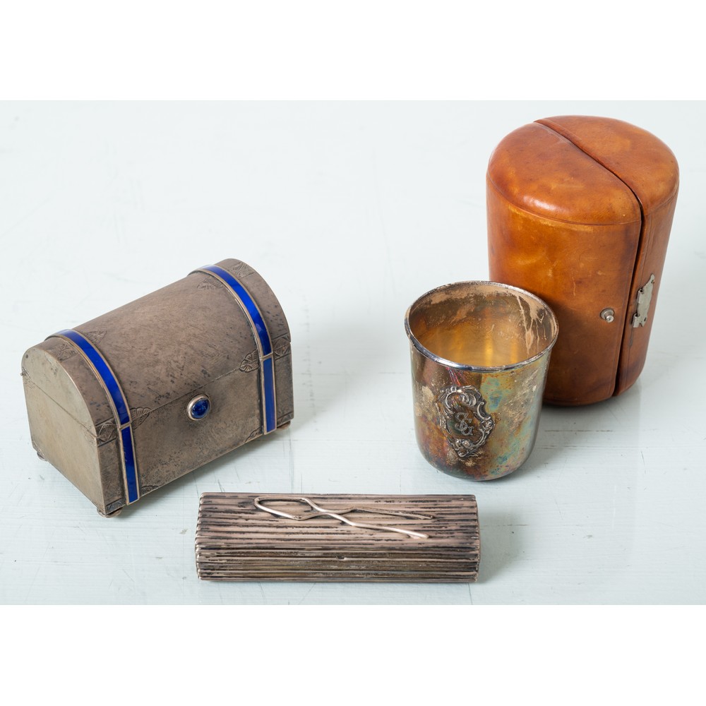 Piccolo portagioie in argento con smalti e cabochon in pietra dura, portaspilli in argento Inglese 925 e piccolo bicchiere in argento con monogramma entro custodia (usure e mancanza) (g. 230 peso lordo).