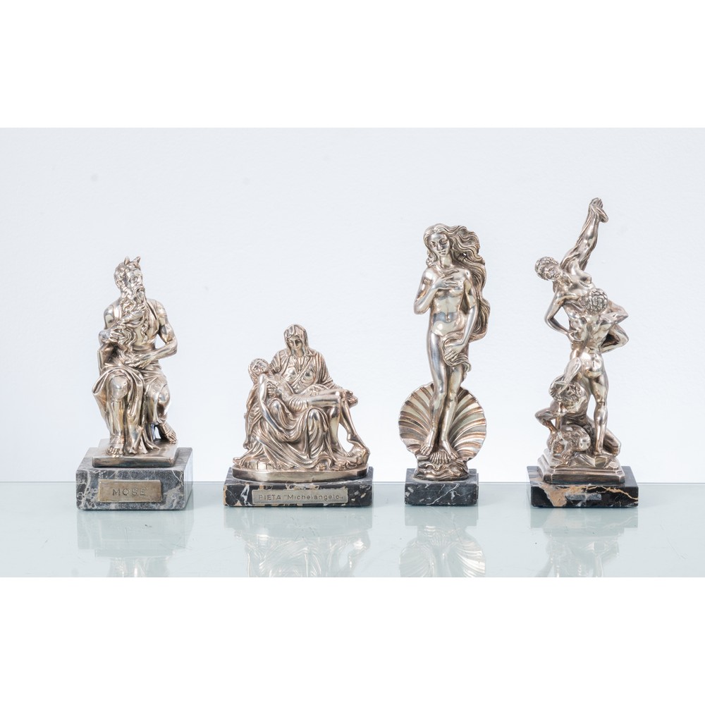 Quattro sculture rivestite in lastra d'argento (g. 140 circa) raffiguranti riproduzioni di opere d'arte: "La Pietà del Michelangelo", "Il Ratto delle Sabine del Giambologna", "La Venere del Botticelli" e "Mosè del Michelangelo".