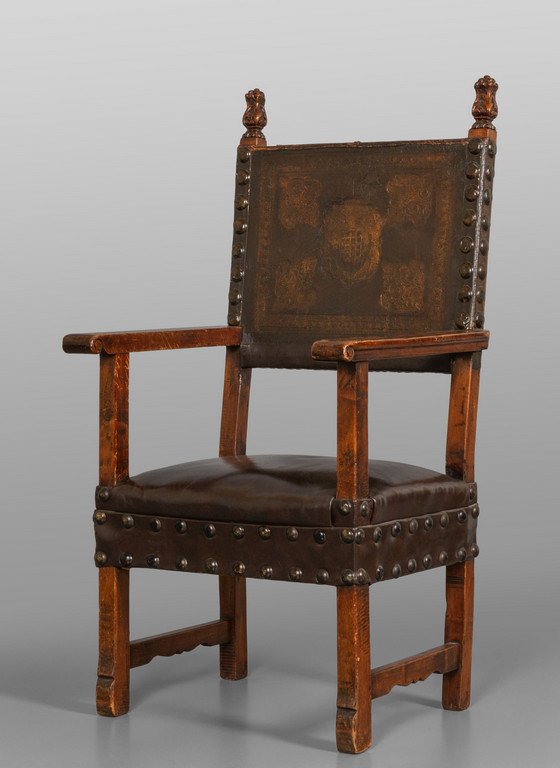 Precedente Lotto 0003 Successivo Aste Boetto - Via Mura dello Zerbino 10R, 16122 Genova ASTA DI ANTIQUARIATO E DIPINTI SEC.XIX Asta di Antiquariato e dipinti sec.XIX martedì 10 dicembre 2024 ore 15:00 (UTC +01:00) MOBILE Poltrona a rocchetto foderata in cuoio impresso sec.XIX