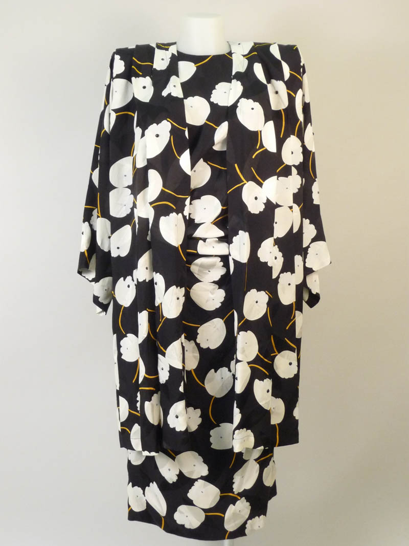 COMPOSÈ A FANTASIA IN CREPE - CREPE PATTERN DRESS fantasia floreale nei toni del bianco, arancio e nero, pistilli in perline nere, giachina imbottita sulle spalle, abito con drappeggio laterale con fermezza di fiocco nero rivestito di strass tg L circa