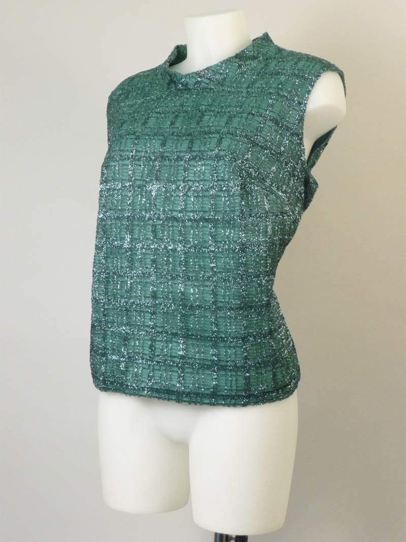TOP VERDE - GREEN TOP lavorata a motivi di quadri in lamè argento su fondo di raso verde tg M circa
