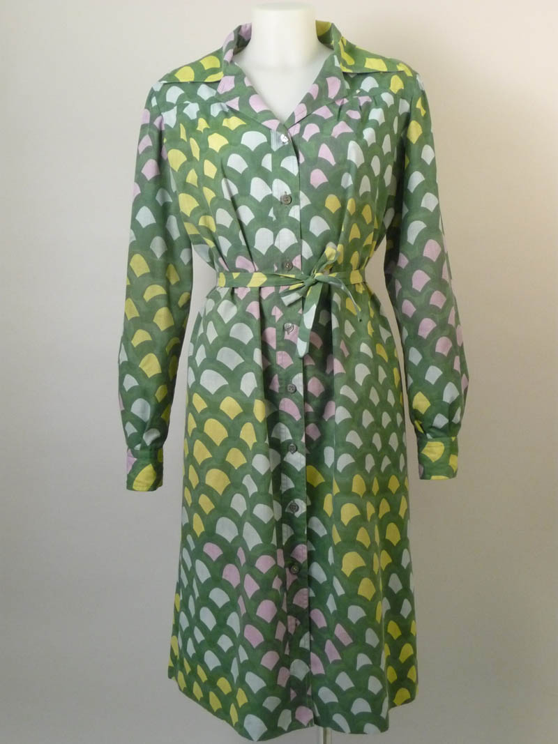 ABITINO IN COTONE COPRICOSTUME A FANTASIA - PATTERN COTTON DRESS Livio de Simone made in Capri, Anni Settanta abbottonatura sul davanti, cinturino in vita piccole riprese sulle spalle tg L circa