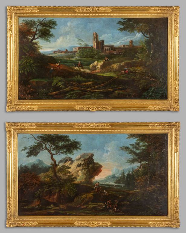 Scuola romana sec.XVIII 'Paesaggi animati con figure' coppia di olii