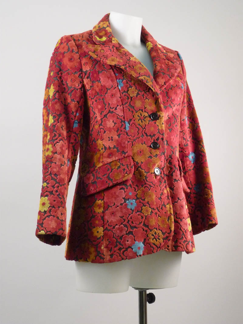 GIACCHINA IN VELLUTO DEVORÈ - VELVET DEVORÈ JACKET realizzata a motivi floreali nei toni del rosso, blu e giallo, lievi difetti tg M circa