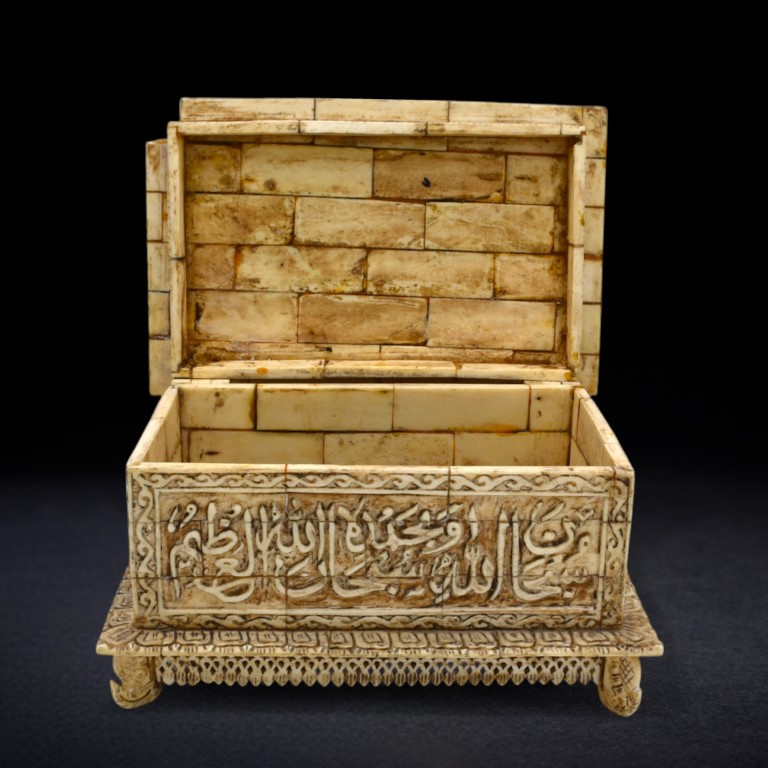 Made of several bone palques with dense plant motifs and religious inscriptions in Arabic within circular reserves.