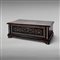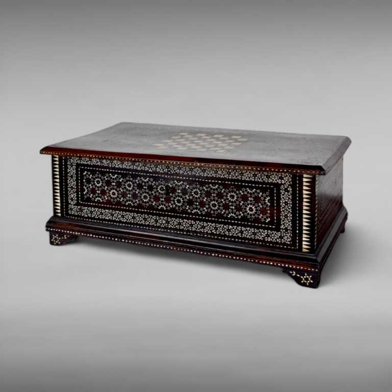 Rectangular chest with hinged lid, inlaid with bone micromosaic tesserae, forming traditional decoration with starbursts, stylised arabesques, roundels and geometric patterns which cover every side of the chest. The top is decorated with a chessboard. A similar item was auctioned by Sotheby's London last 7th October (lot 323), and another one is located in Victoria and Albert Museum (Acc. no. 7224-1860).