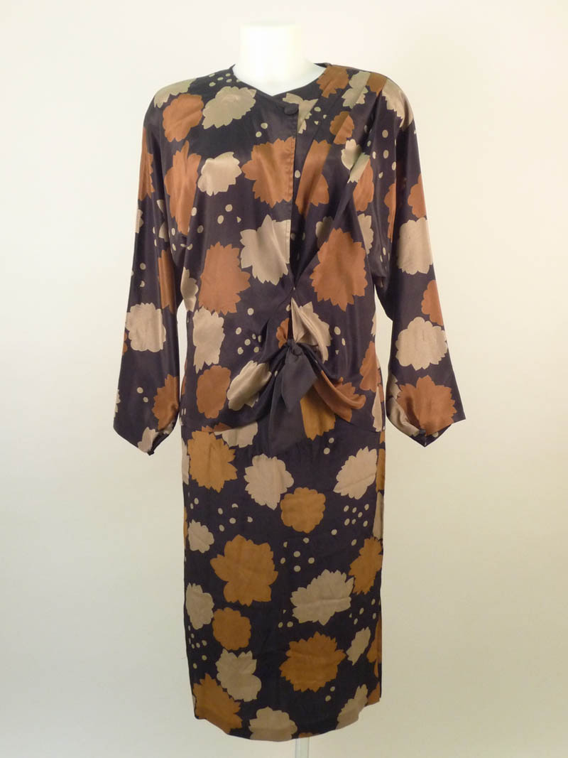 COMPLETO A FANTASIA IN CREPE - CREPE COMPOSÈ realizzato con fantasia vegetale nei toni del marrone e nocciola su fondo nero tg M circa