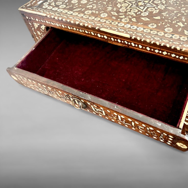 Rectangular with central drawer with metal fittings. The exterior with bone and mother-of-pearl inlaid decoration of vases of flowers arranged within large cartouches with corner decoration. Each side bears a six-pointed star inlaid with mother-of-pearl. The drawer shows an inscription in Arabic characters that reads: Ya Fattah (the One who opens), Ya Razzaqh (the One who feeds), ... Vassalamah (salutation).