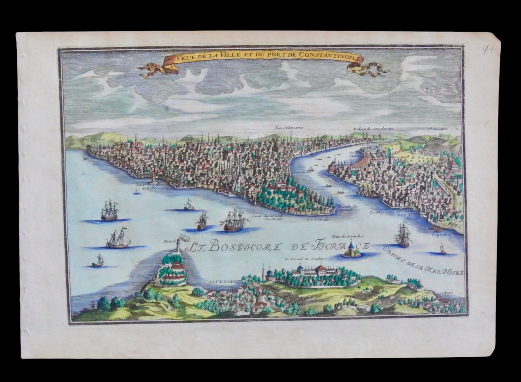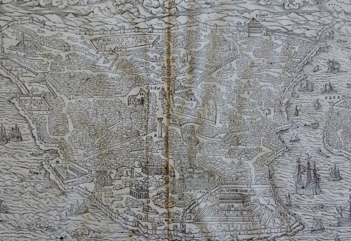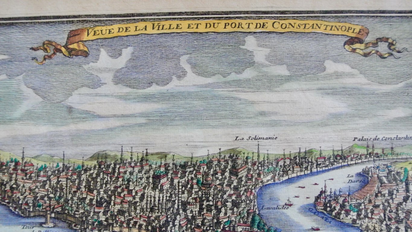 Two engravings depicting Istanbul in 'bird's eye' view. One of them probably of French production, coloured; the other with extensive description in Latin.