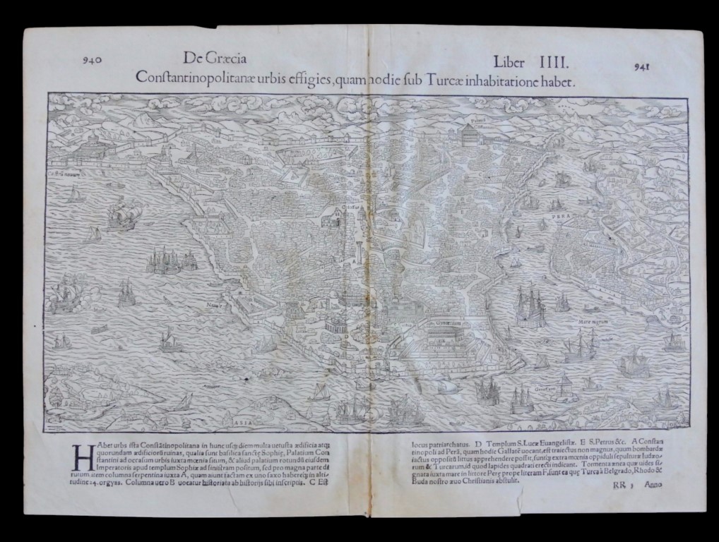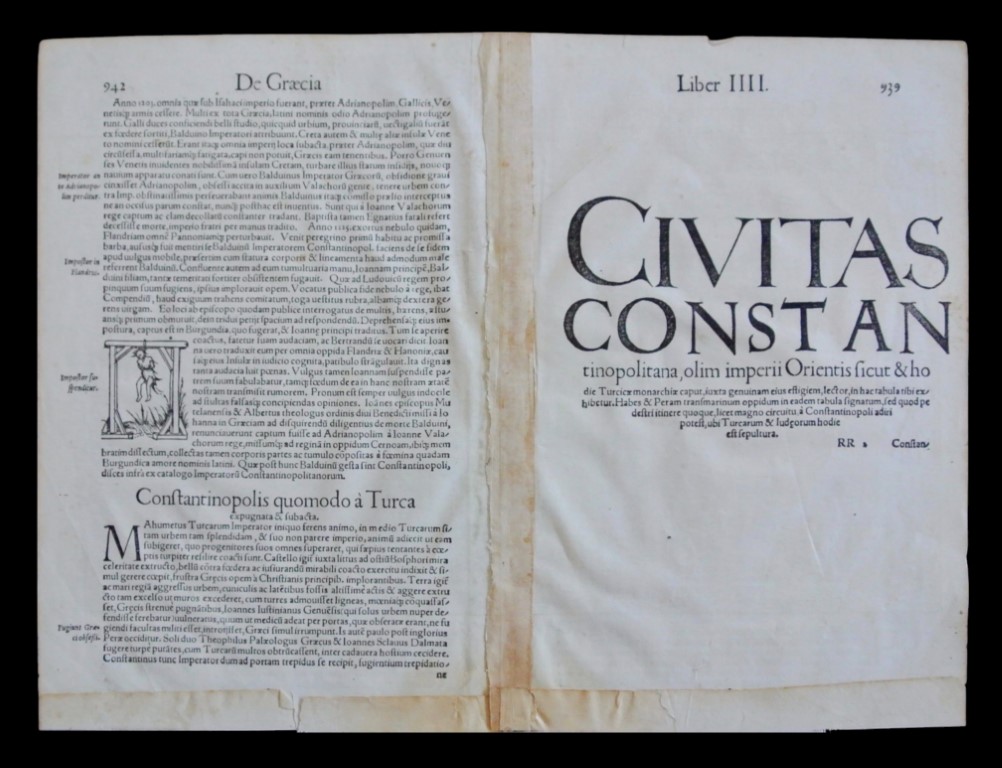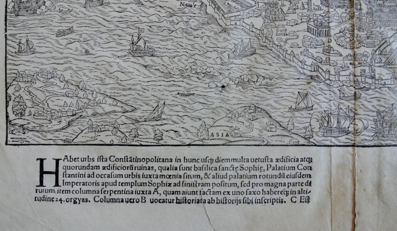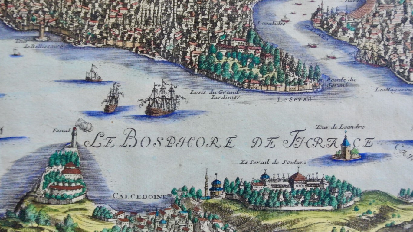Two engravings depicting Istanbul in 'bird's eye' view. One of them probably of French production, coloured; the other with extensive description in Latin.